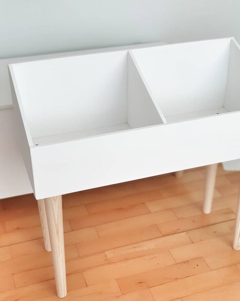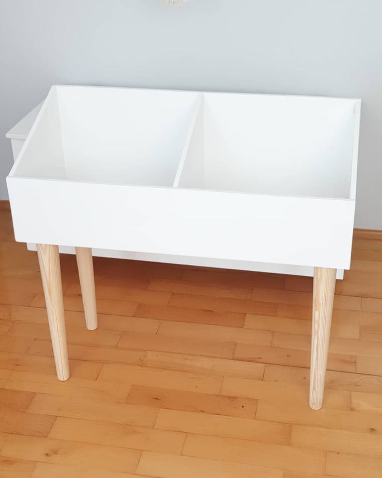 Biblioteczka stojąca na książki i zabawki wykonana z drewnianej sklejki sosnowej z nóżkami z drewna sosnowego. Regał pomalowany w kolorze białym wodorozcieńczalną emalią akrylową rekomendowaną przez Polskie Towarzystwo Alergologiczne bezpieczne i przeznaczone dla najmłodszych, nóżki pomalowane ochronnym bezbarwnym lakierem.