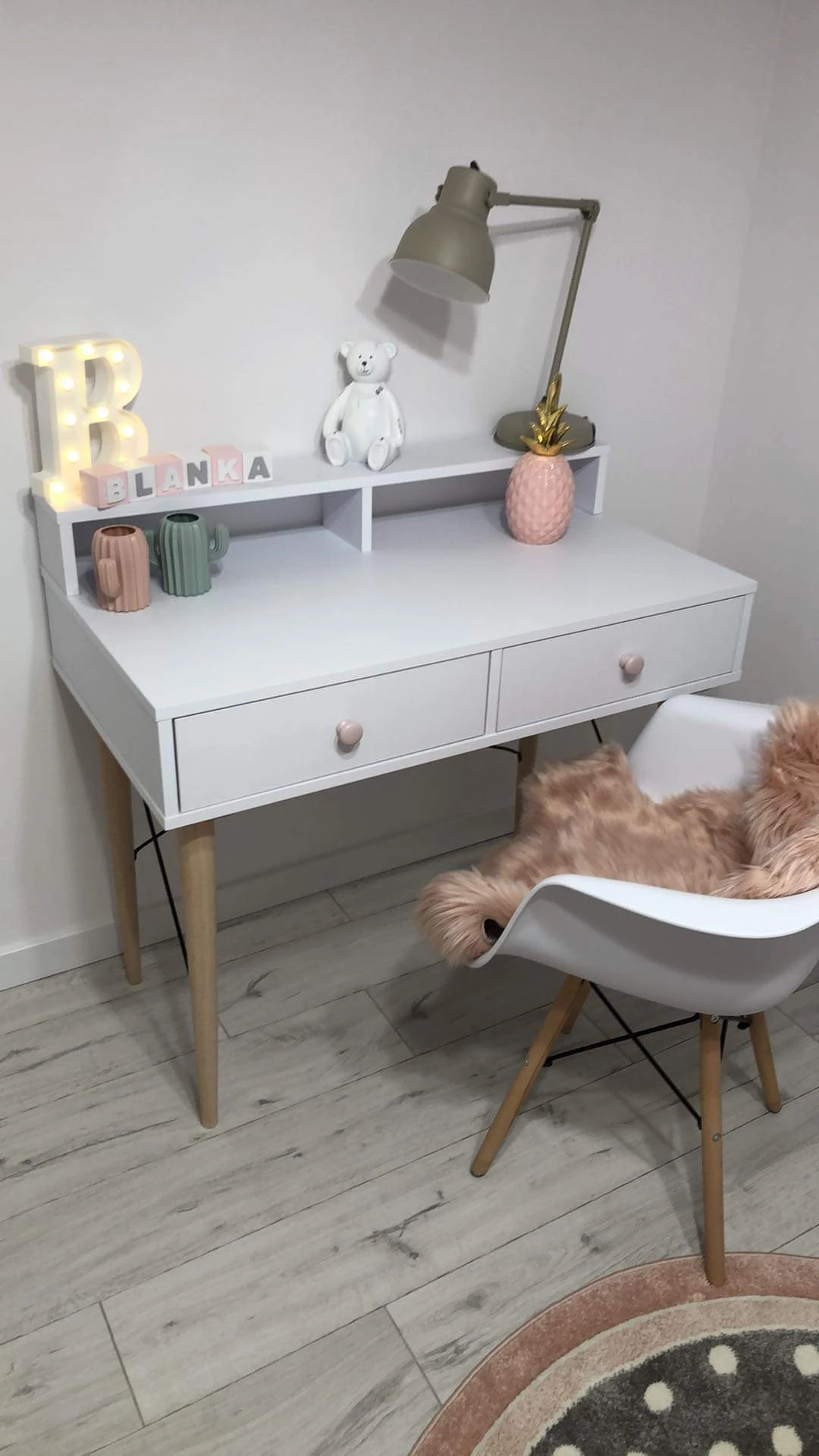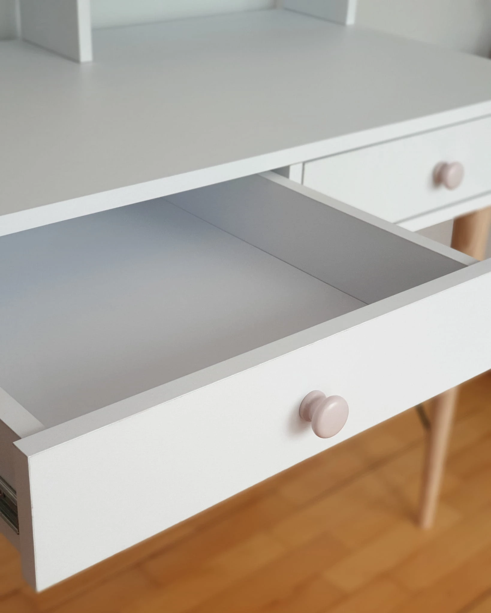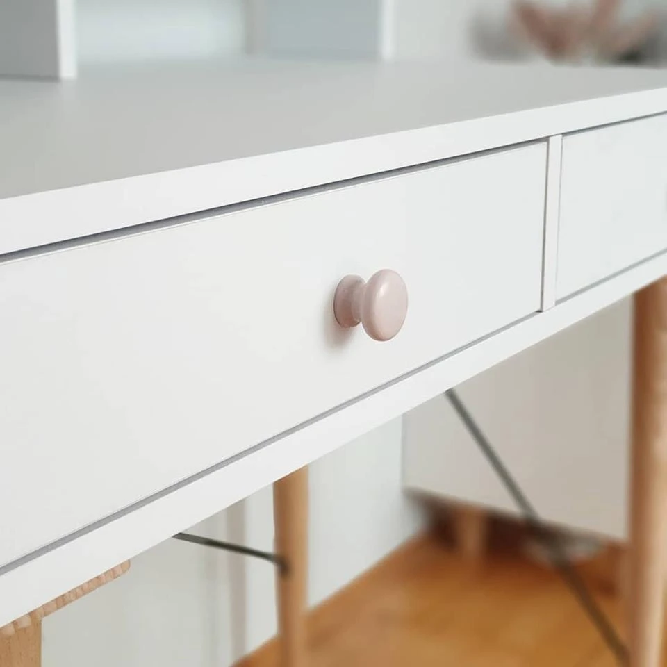 Biurko posiada dwie szuflady. Szuflady zamontowane na prowadnicach kulkowych z cichym domykiem. Dwie drewniane gałki pomalowane w kolorze pudrowego różu.