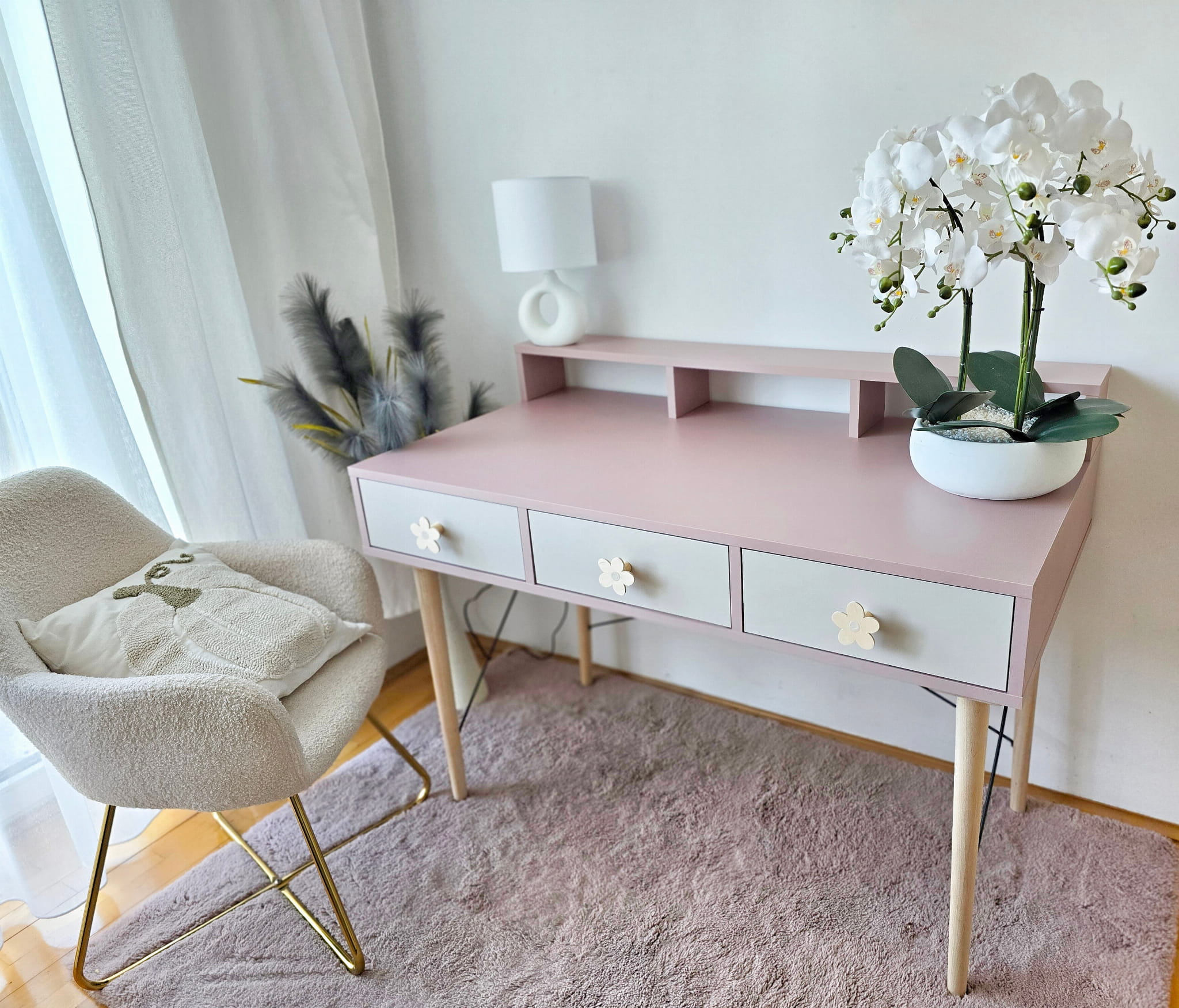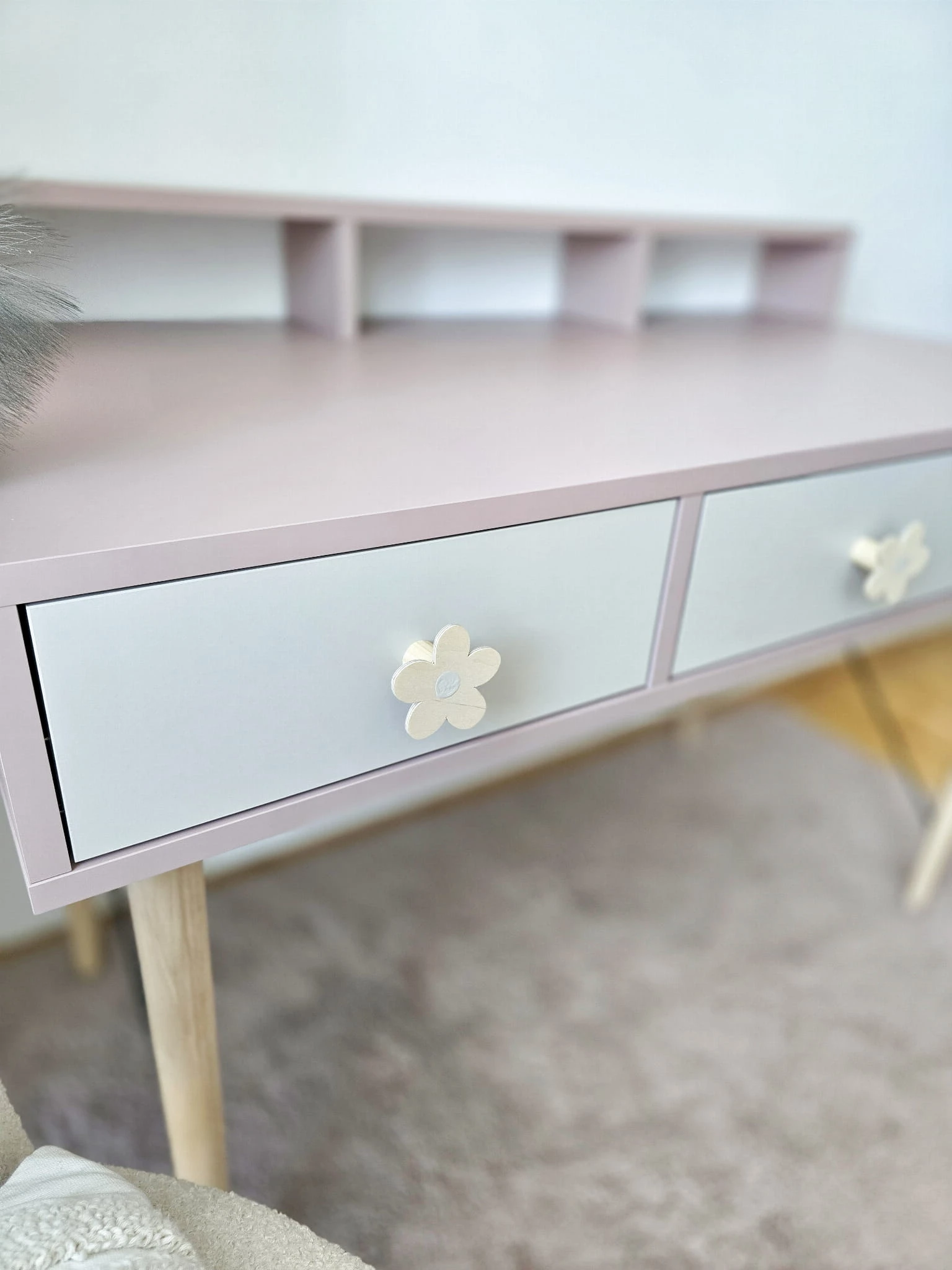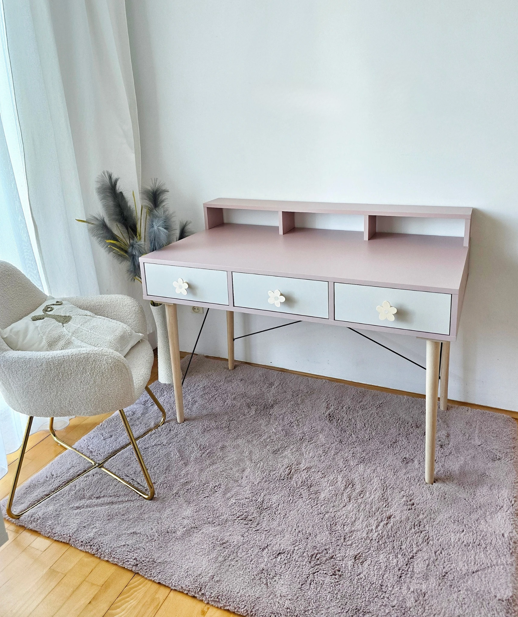 Biurko wykonane z płyty meblowej w kolorze brudnego różu, antyczna róża, trzech pojemnych szufladek w kolorze kaszmiru, drewnianych nóg bukowych lakierowanych bezbarwnym ekologicznym lakierem oraz drutów podtrzymujących konstrukcję biurka w kolorze czarnym drewnianych uchwytów w kształcie kwiatuszka z beżowym środkiem