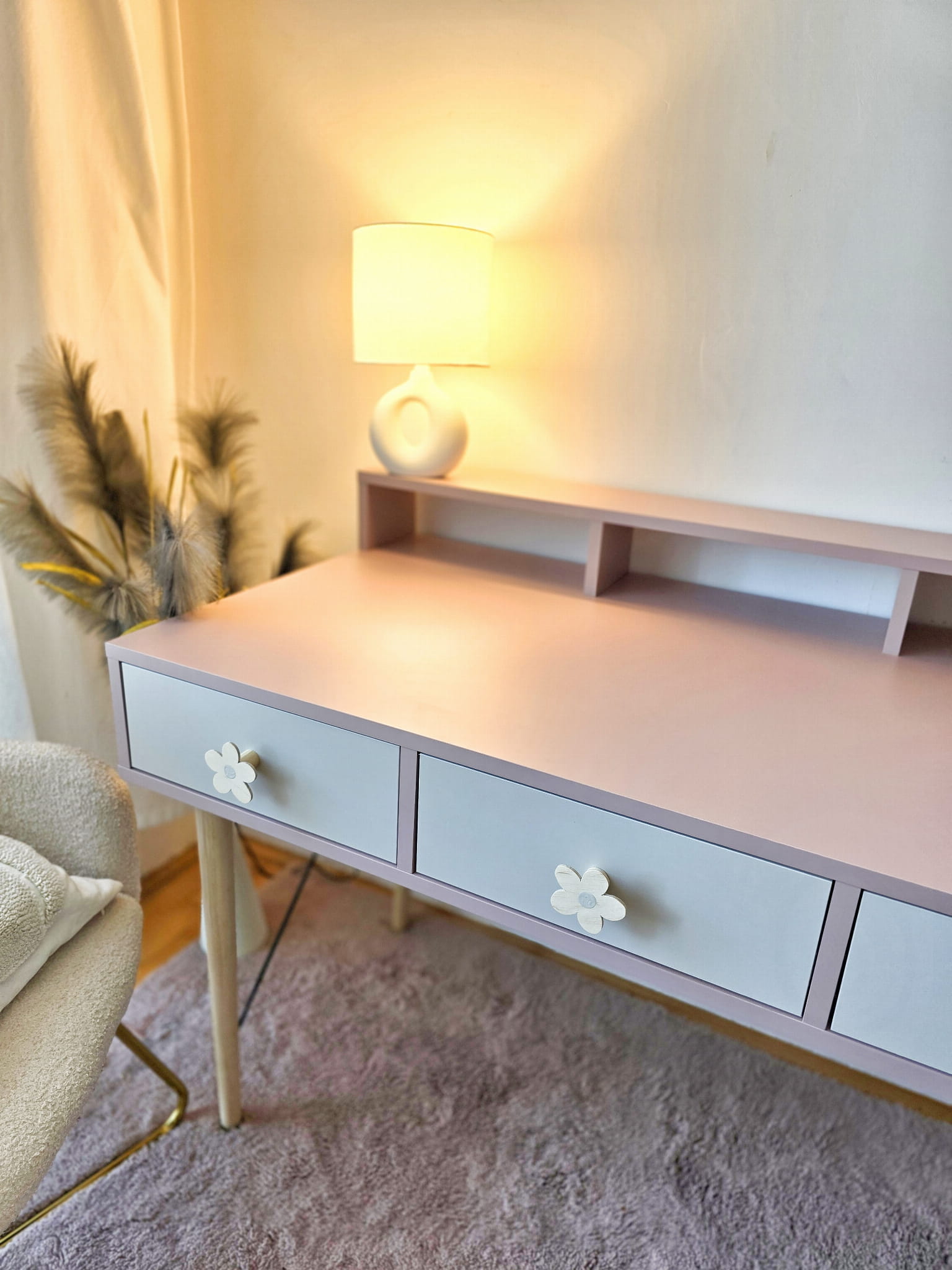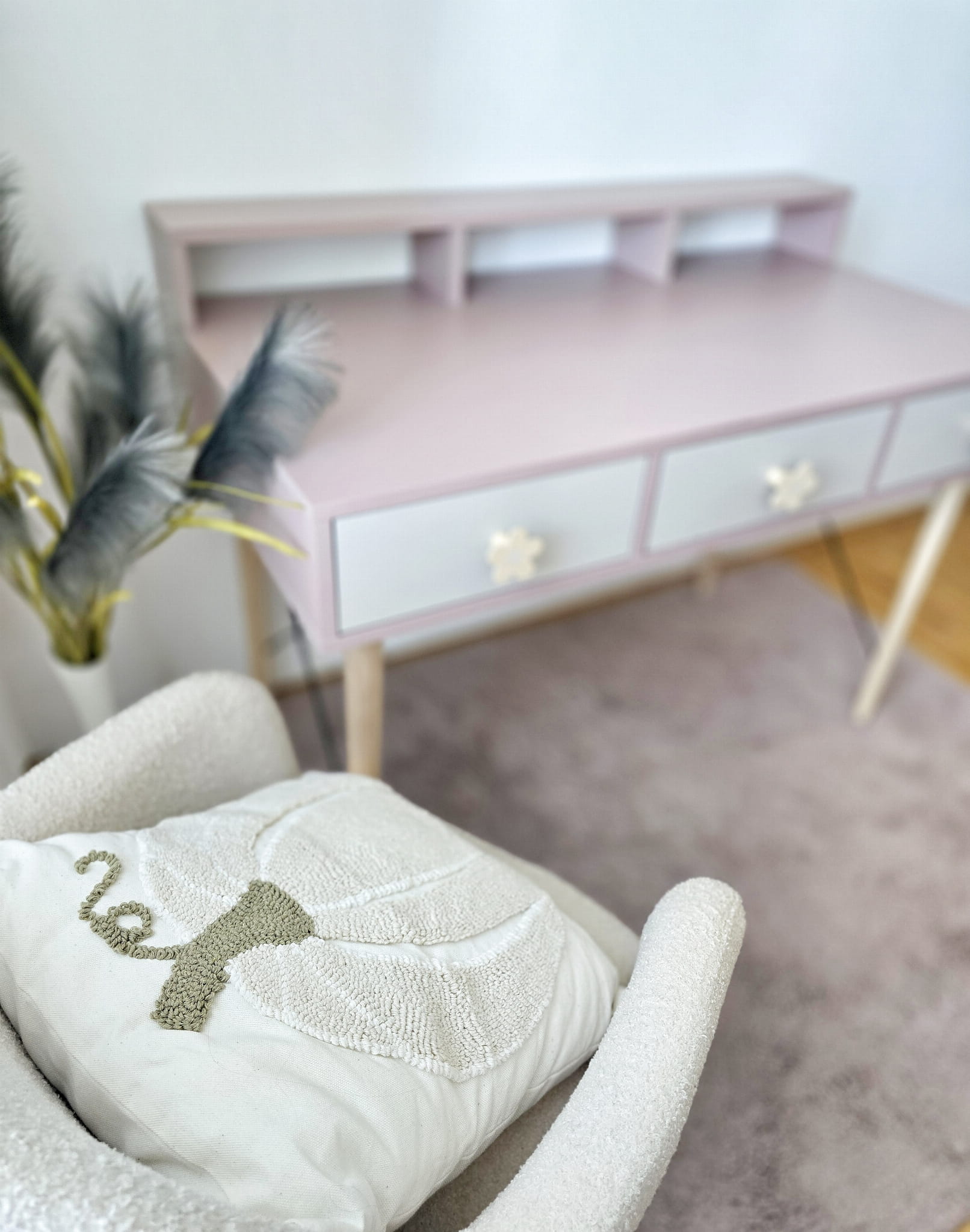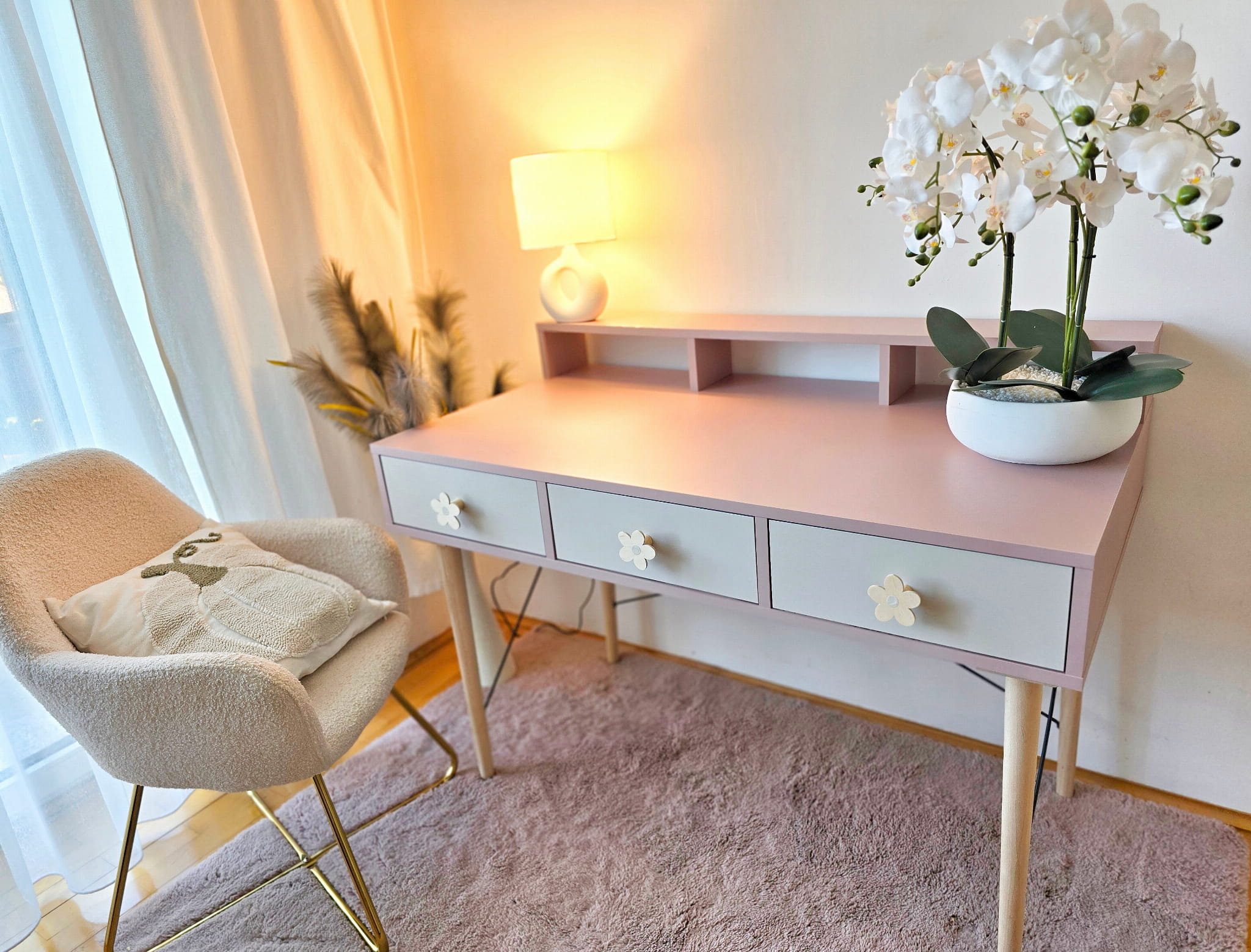 Biurko wykonane z płyty meblowej w kolorze brudnego różu, antyczna róża, trzech pojemnych szufladek w kolorze kaszmiru, drewnianych nóg bukowych lakierowanych bezbarwnym ekologicznym lakierem oraz drutów podtrzymujących konstrukcję biurka w kolorze czarnym drewnianych uchwytów w kształcie kwiatuszka z beżowym środkiem