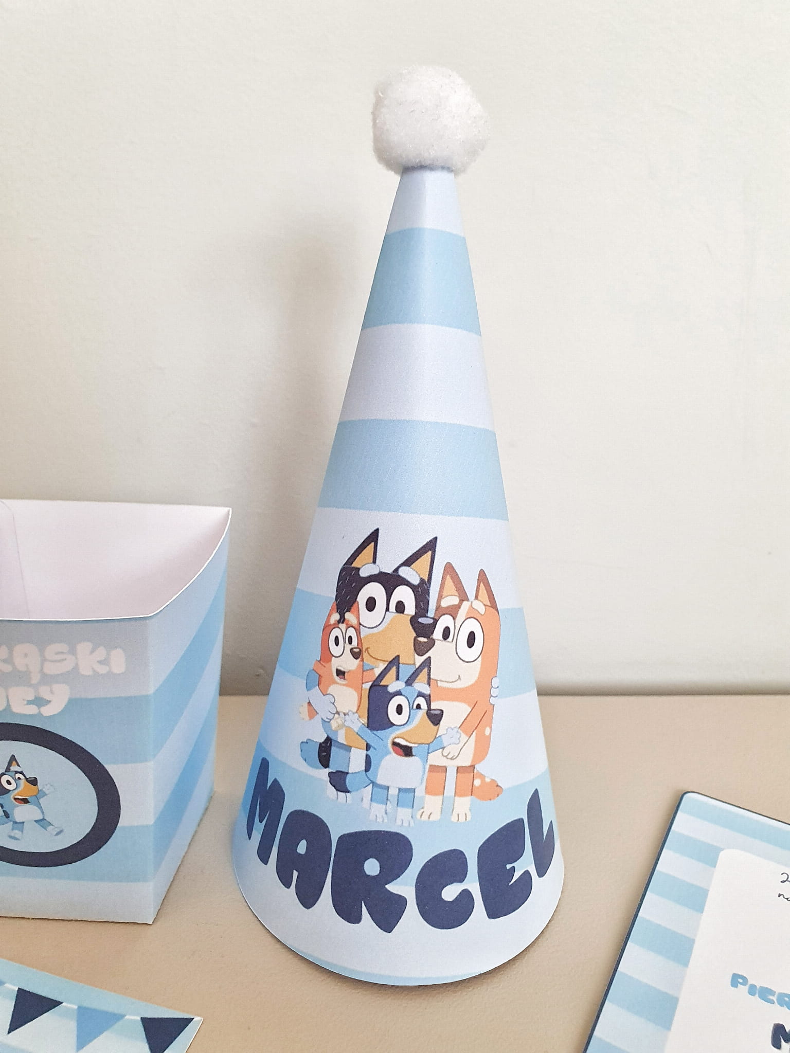 Czapeczka urodzinowa dekoracyjna z pomponem Bluey