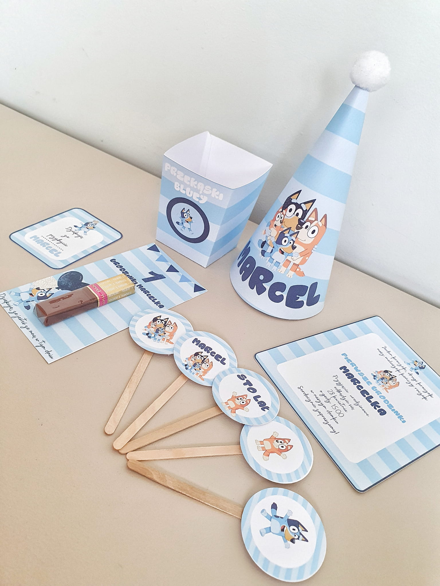 Kolor błękitne paski z motywem Bluey, granatowy napis i pompon.