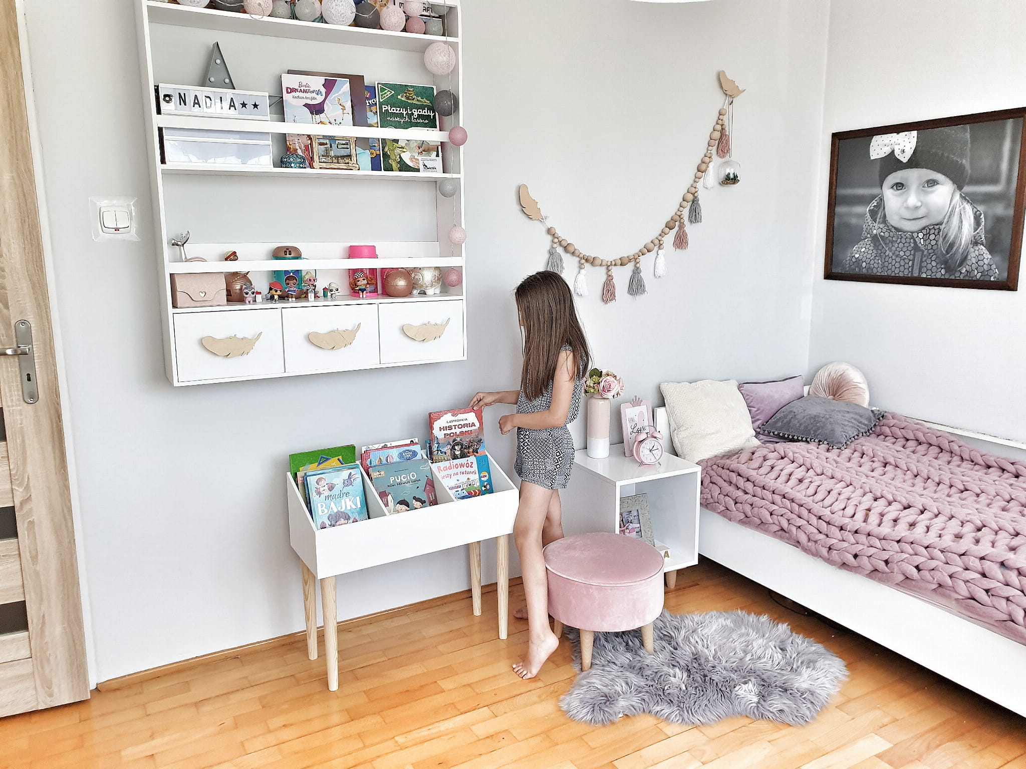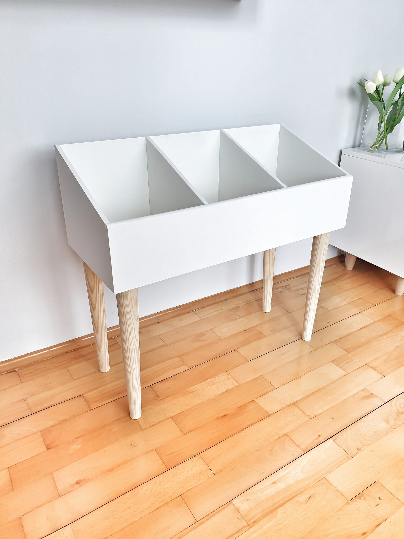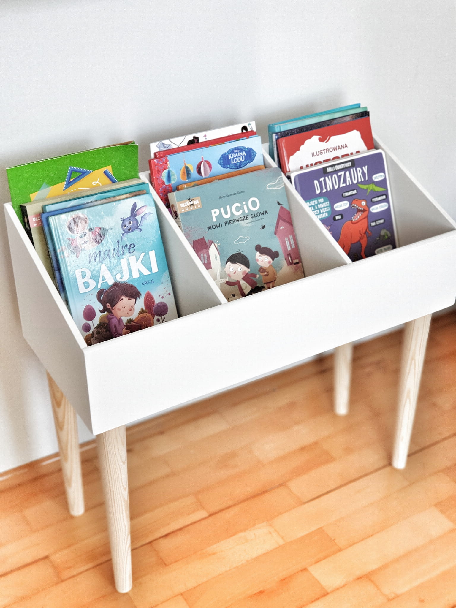 Biblioteczka stojąca na książki i zabawki wykonana z drewnianej sklejki sosnowej z nóżkami z drewna sosnowego. Regał pomalowany w kolorze białym wodorozcieńczalną emalią akrylową rekomendowaną przez Polskie Towarzystwo Alergologiczne bezpieczne i przeznaczone dla najmłodszych, nóżki pomalowane ochronnym bezbarwnym lakierem.