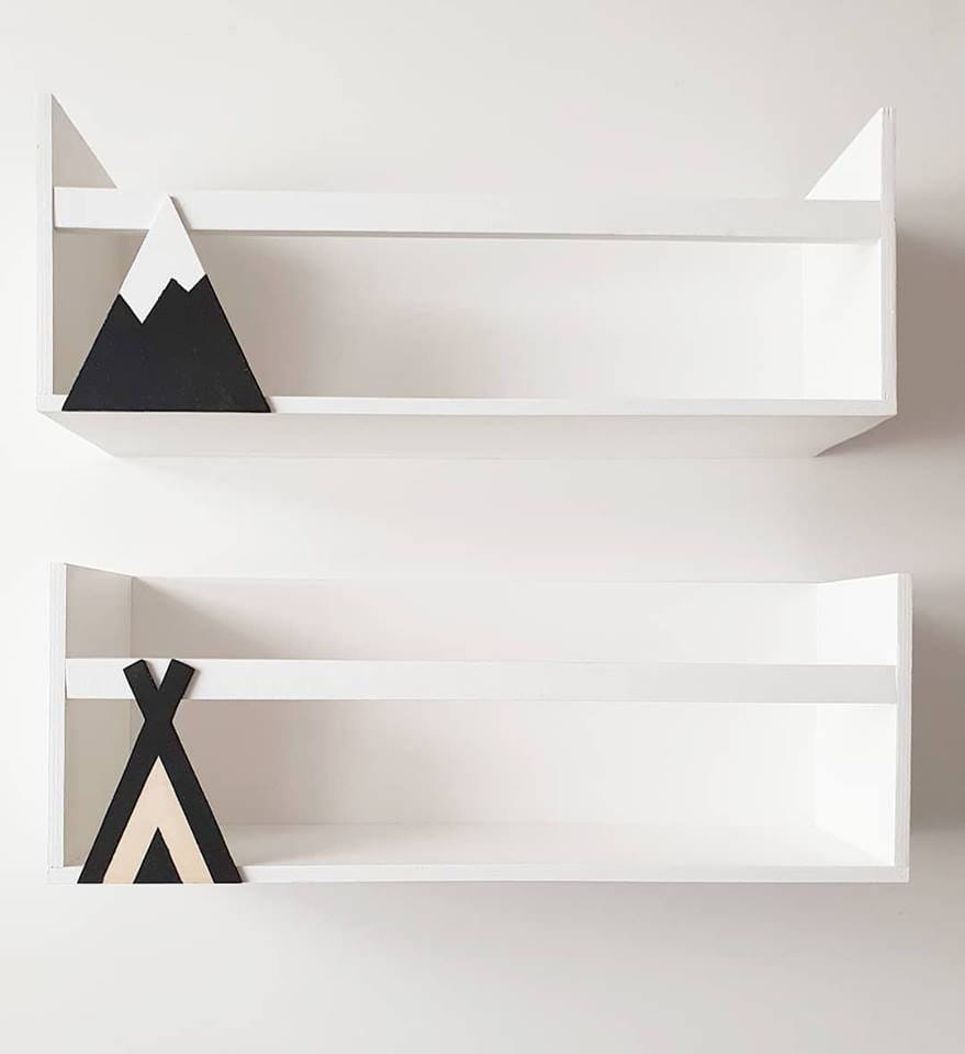 Półka wykonana z drewnianej sklejki sosnowej pomalowana w kolorze białym wodorozcieńczalną emalią akrylową rekomendowaną przez Polskie Towarzystwo Alergologiczne bezpieczną i przeznaczoną dla najmłodszych, góra w kolorach czerni i bieli.