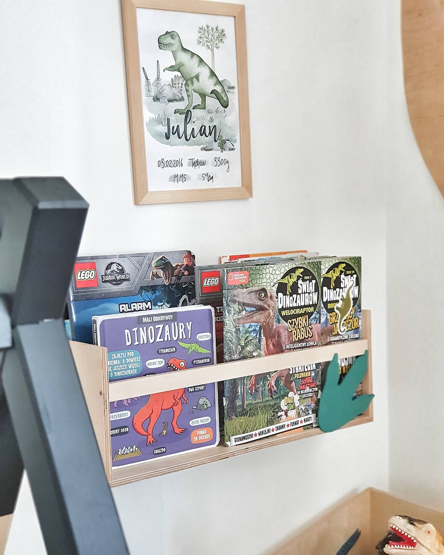 Drewniana półeczka na książki z motywem łapy dinozaura