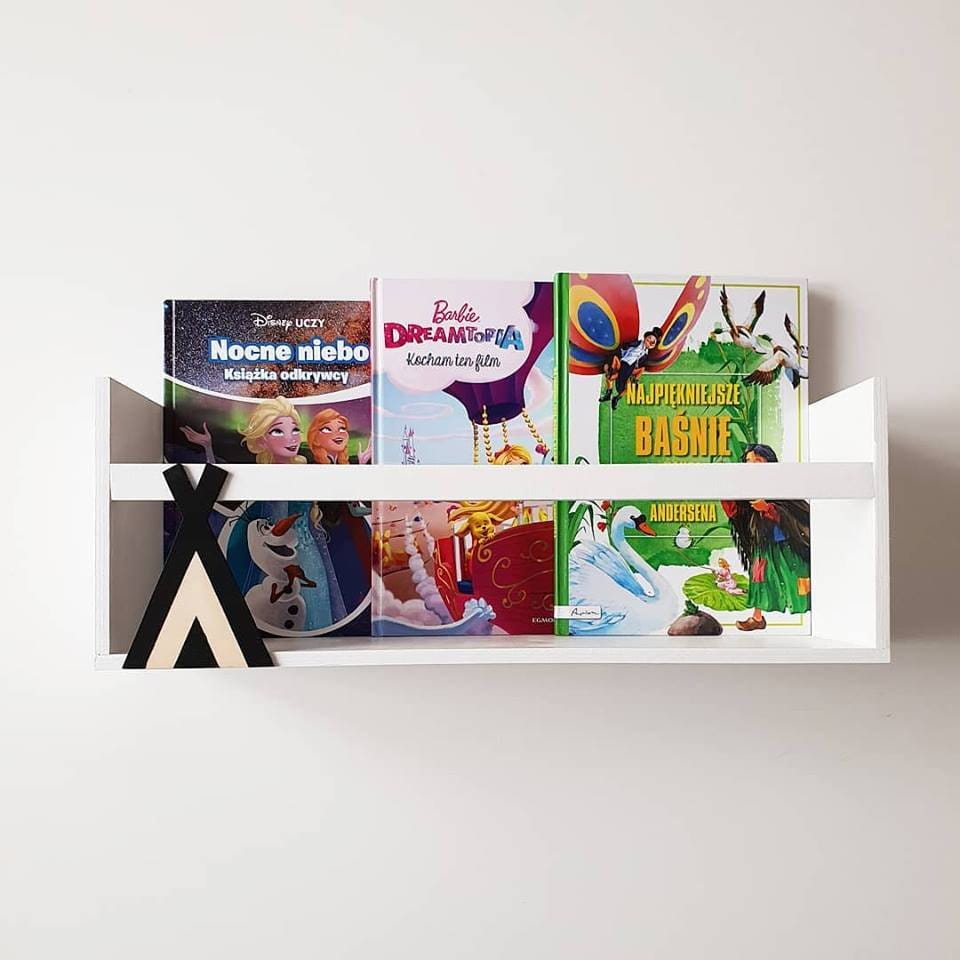 Półka wykonana z drewnianej sklejki sosnowej pomalowana w kolorze białym wodorozcieńczalną emalią akrylową rekomendowaną przez Polskie Towarzystwo Alergologiczne bezpieczną i przeznaczoną dla najmłodszych, tipi w kolorze drewna i czerni.