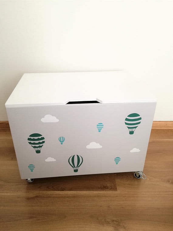 Przód skrzyni koloru jasno szarego z białymi chmurkami, turkusowymi oraz ciemnozielonymi balonami, pozostałe boki skrzyni wraz z pokrywą w kolorze białym.