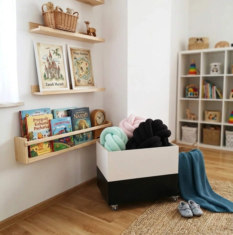 Skrzynia na zabawki wykonana z drewnianej sklejki sosnowej pomalowana farbami ekologicznymi przeznaczonymi dla dzieci, bezpieczne i blokowane koła nie rysujące posadzki.