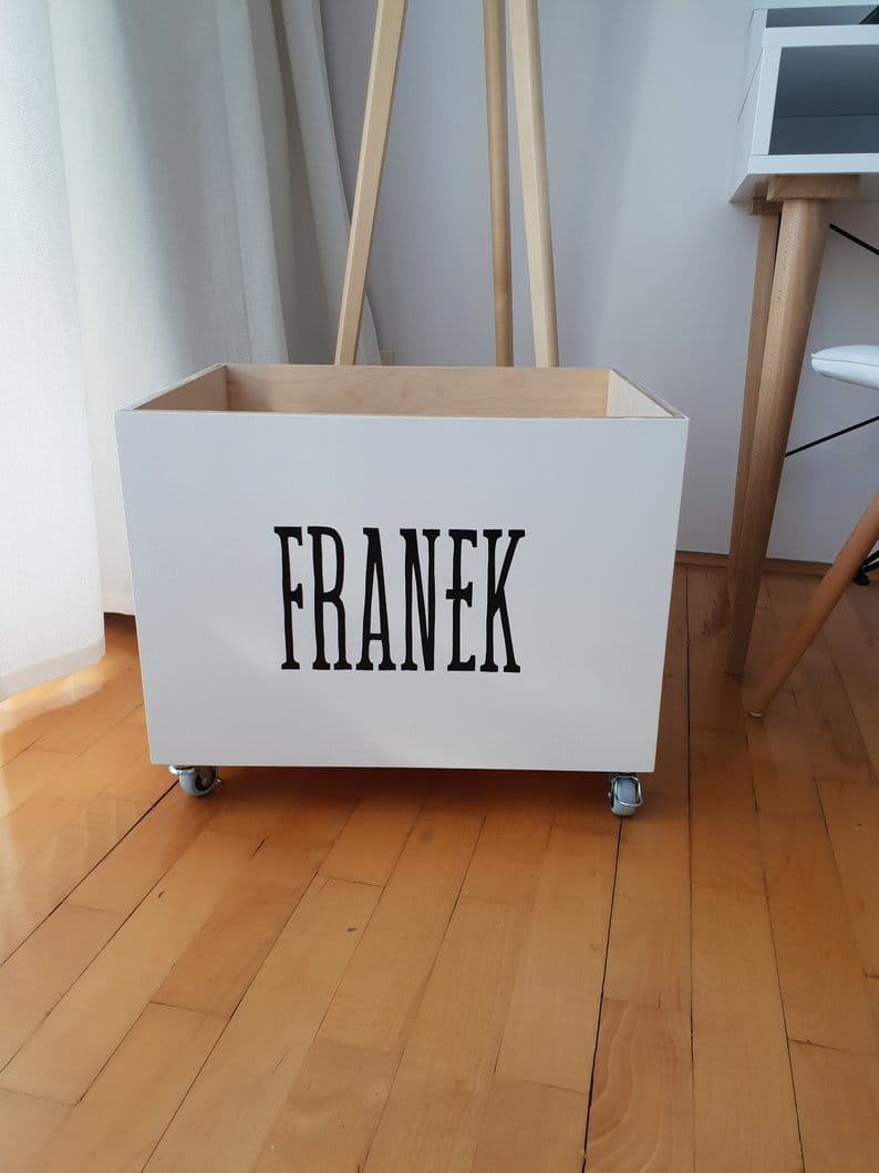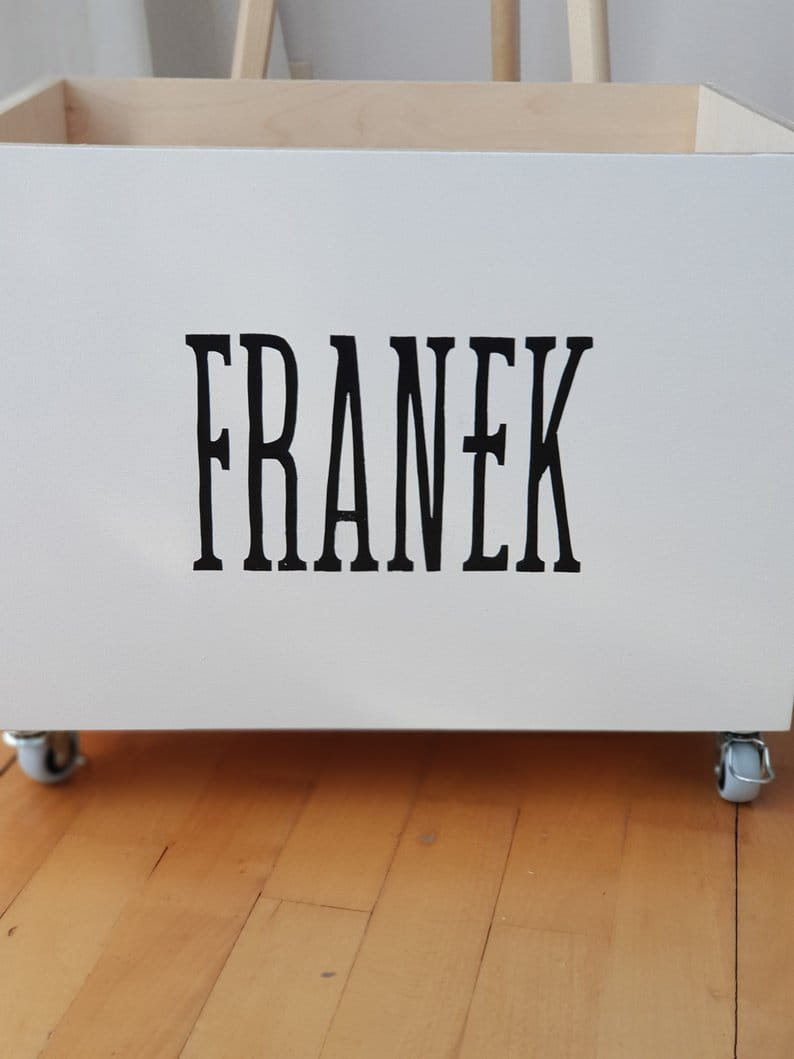 Biała skrzynia z ręcznie malowanym imieniem dziecka, wykonanym ozdobną czcionką koloru czarnego.