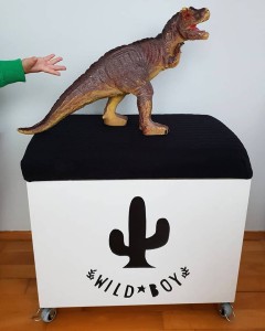 Biała skrzynia z czarnym ręcznie malowanym motywem kaktusa oraz napisem "Wild Boy" z pokrywą z opcją siedziska w kolorze czarnym.