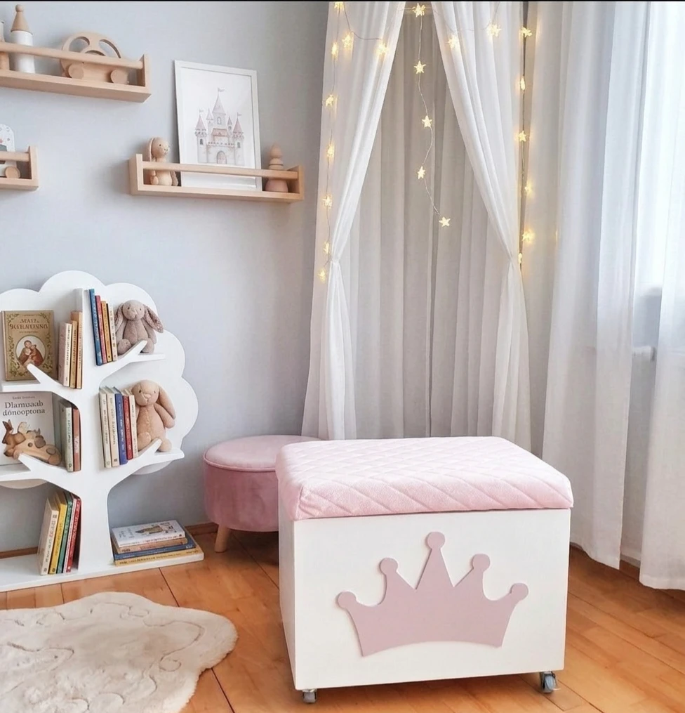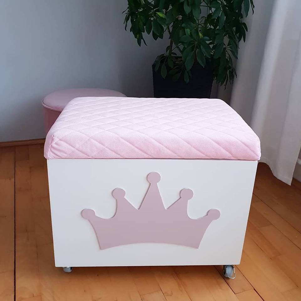 Drewniana skrzynia pojemnik na zabawki "Korona" z pufą siedziskiem