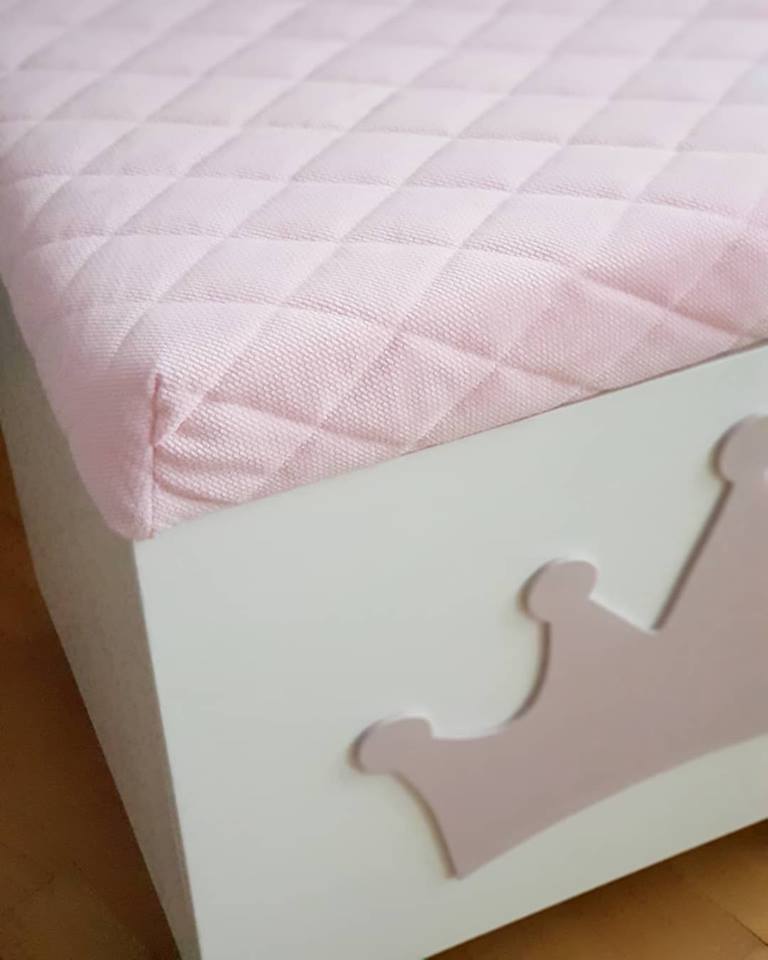 Biała skrzynia z drewnianą pudrowo różową koroną tworzącą efekt 3D z pokrywą z opcją siedziska w kolorze jasnego różu.