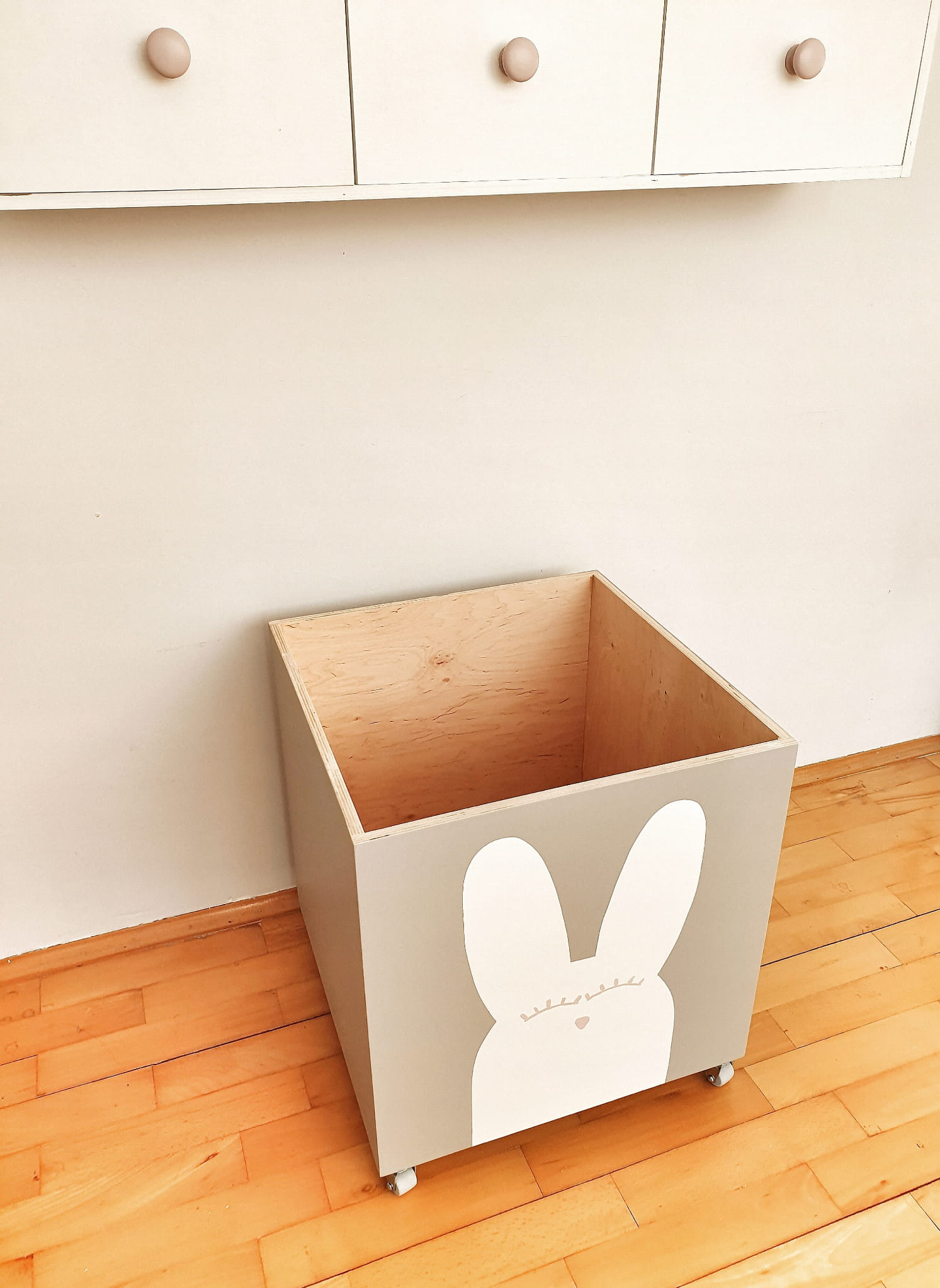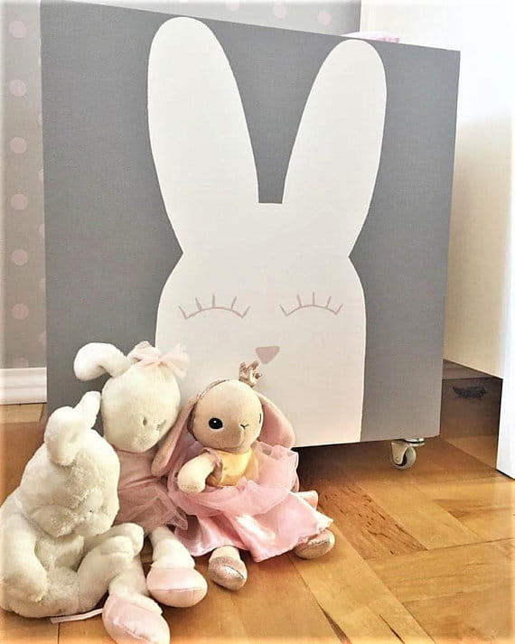 Szara skrzynia z ręcznie malowanym motywem króliczka.