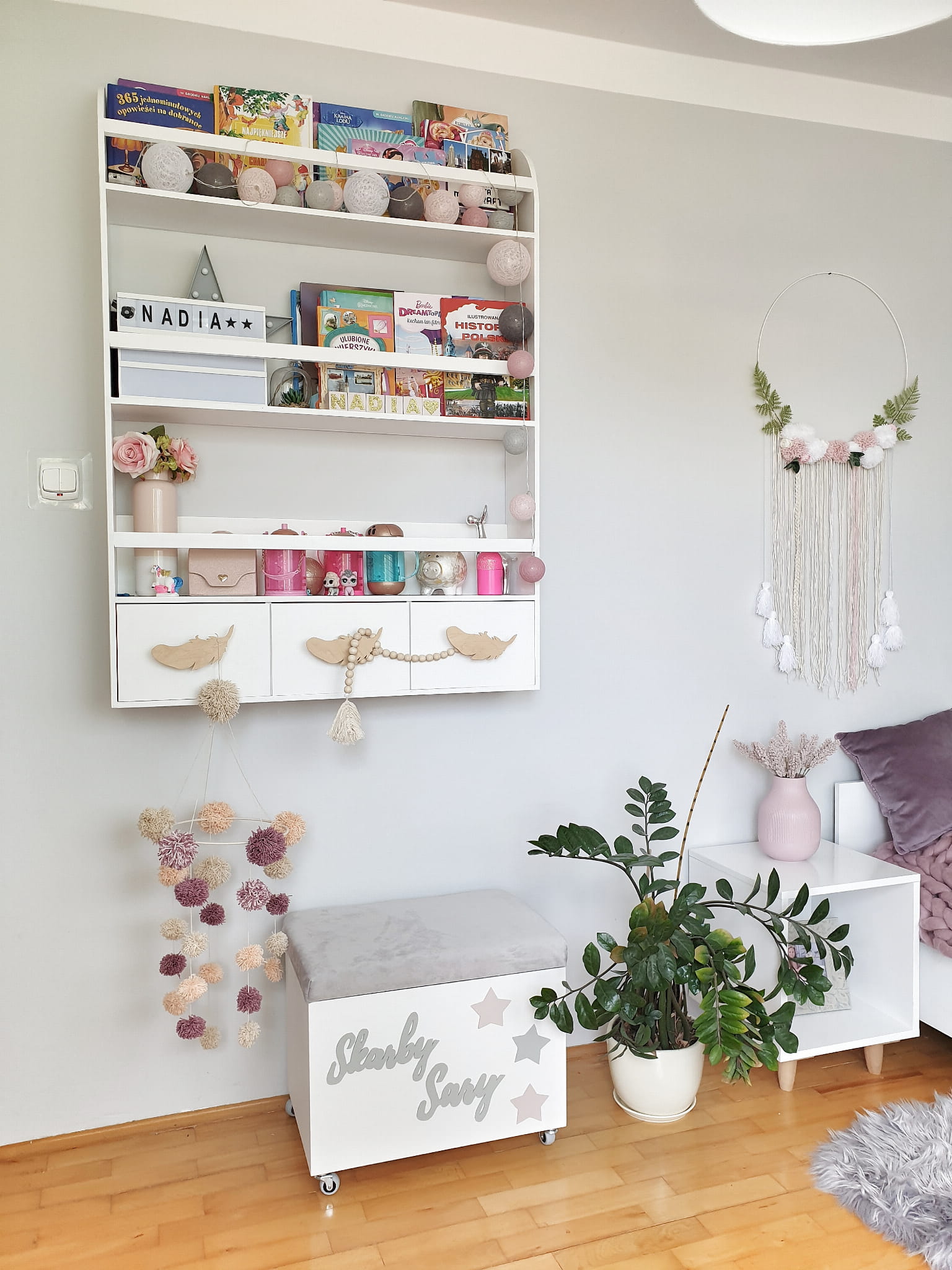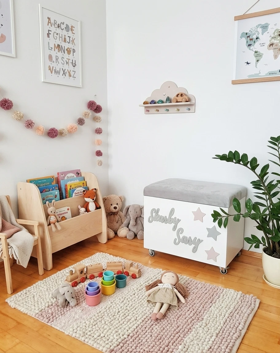 Drewniana skrzynia pojemnik na zabawki "Skarby Sary" z pufą siedziskiem