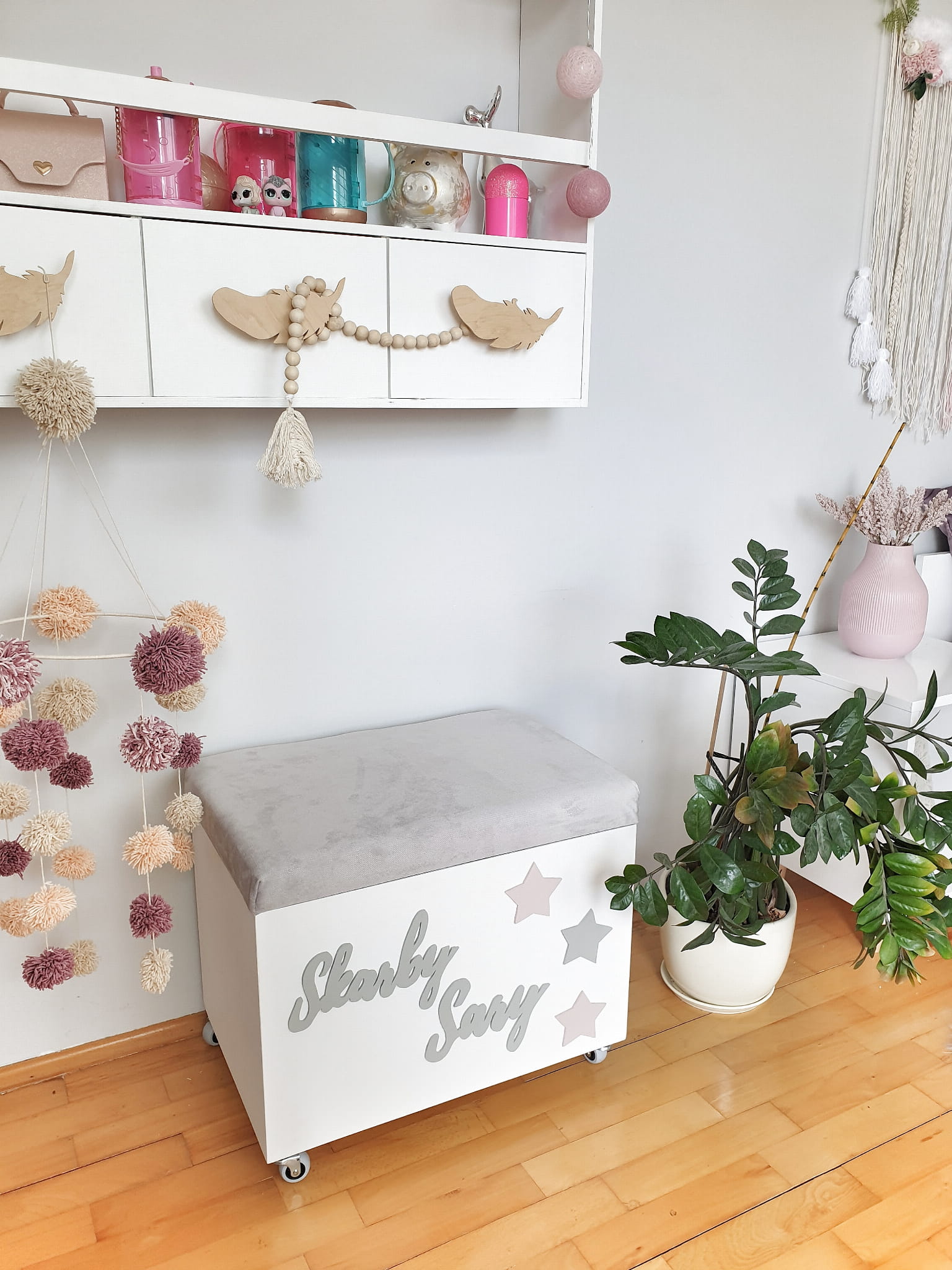 Skrzynia na zabawki wykonana z drewnianej sklejki sosnowej pomalowana farbami ekologicznymi przeznaczonymi dla dzieci, bezpieczne i blokowane koła nie rysujące posadzki.