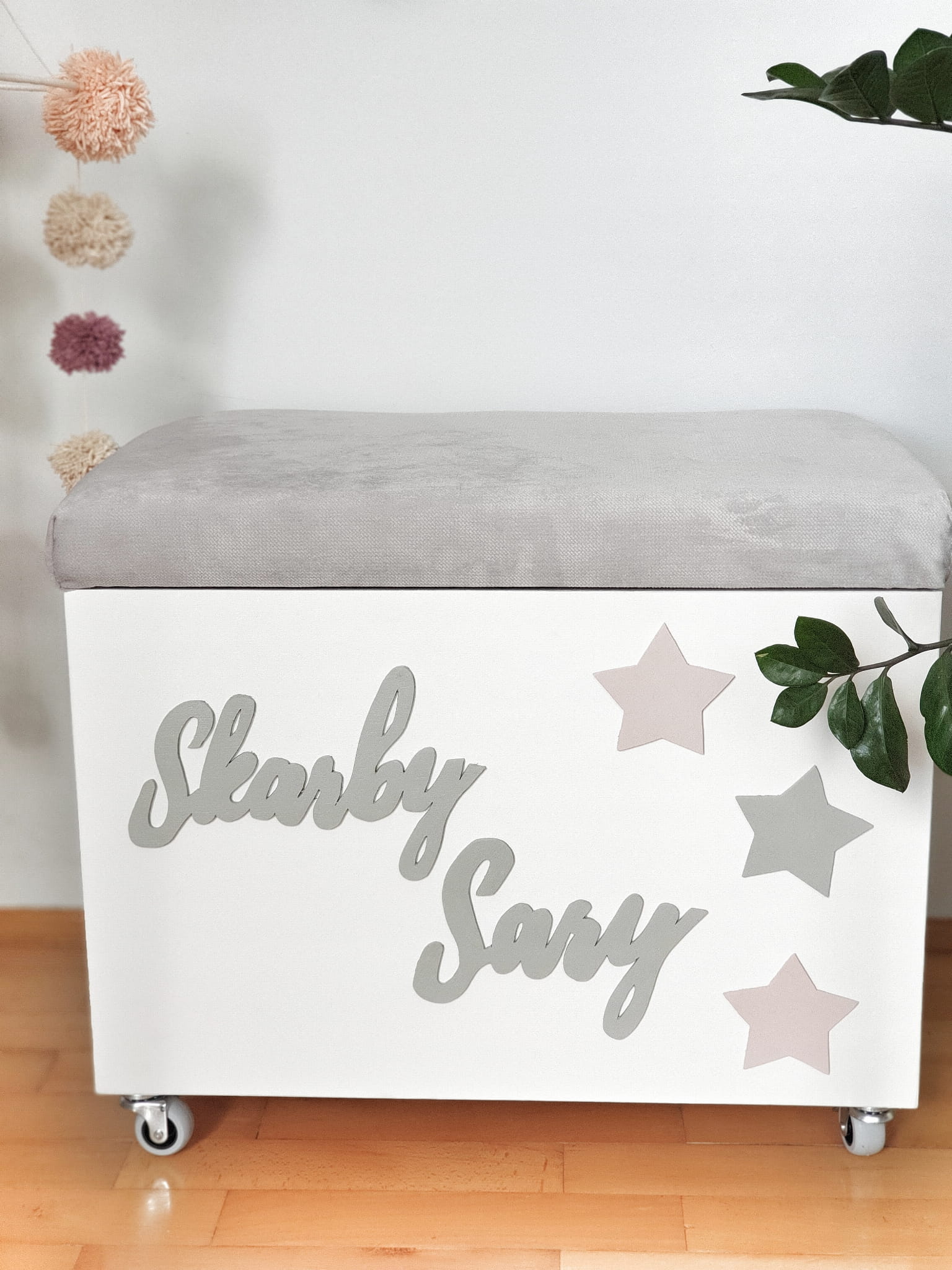 Biała personalizowana skrzynia z szarym drewnianym przyklejanym napisem tworzącym efekt 3D z opcją siedziska w kolorze szarym oraz trzema gwiazdkami.