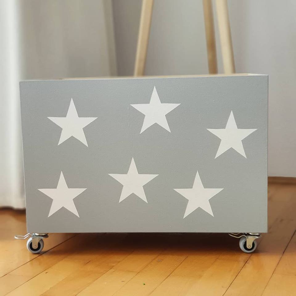 Szara skrzynia z ręcznie malowanymi gwiazdkami w kolorze białym.