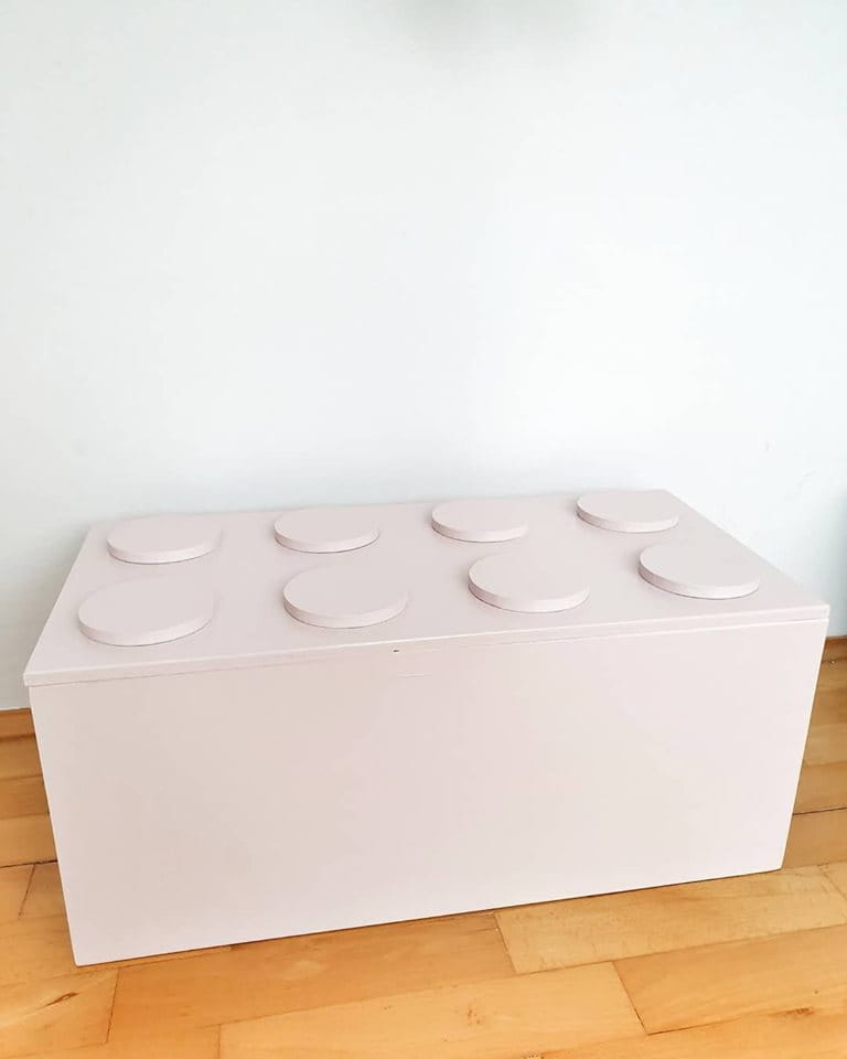 Skrzynka pomalowana w kolorze pudrowego różu wodorozcieńczalną emalią akrylową rekomendowaną przez Polskie Towarzystwo Alergologiczne bezpieczną i przeznaczoną dla najmłodszych.