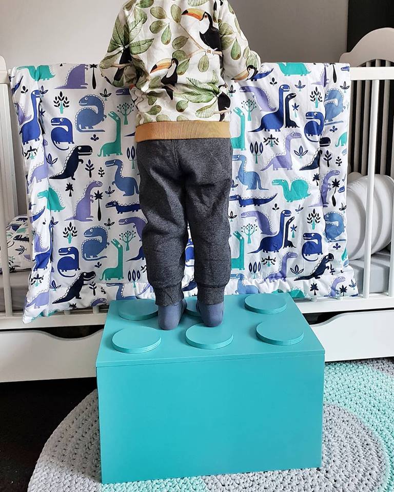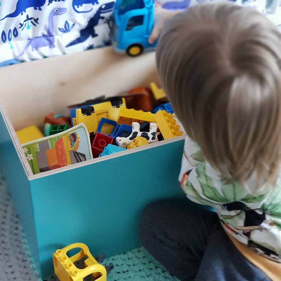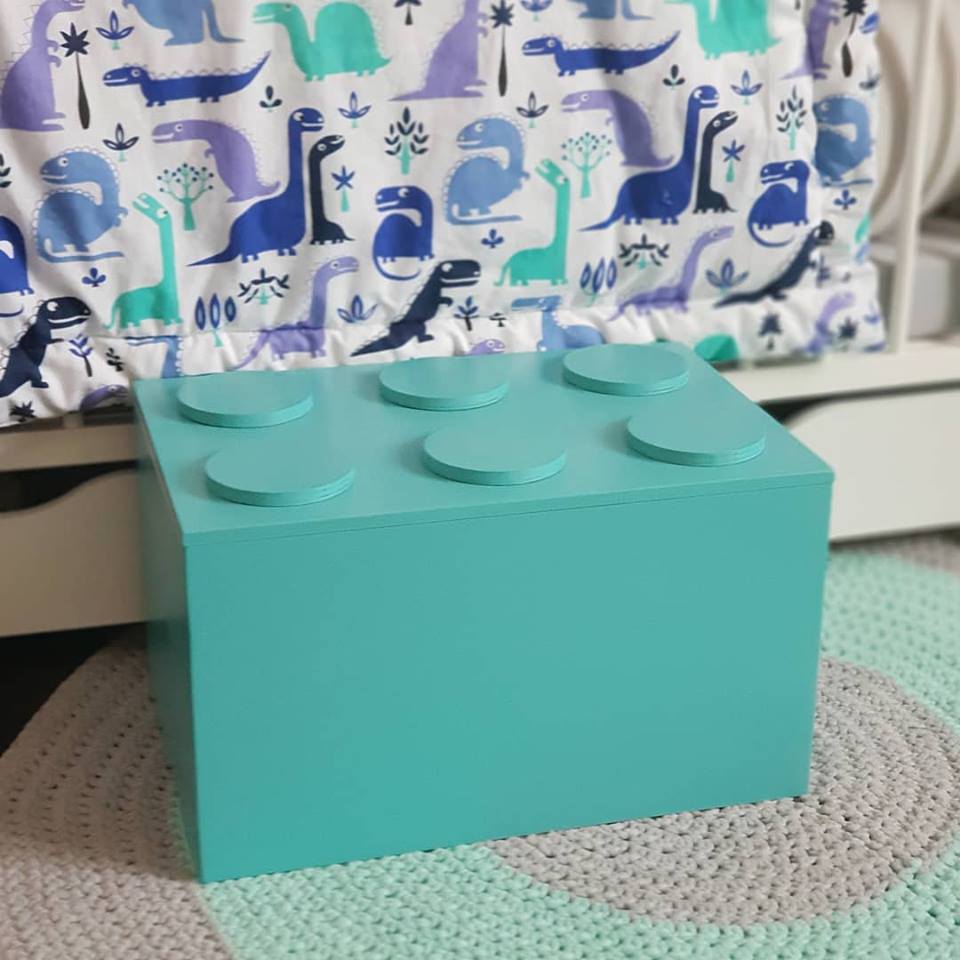 Drewniana skrzynka na zabawki w kształcie klocka Lego średnia turkusowa