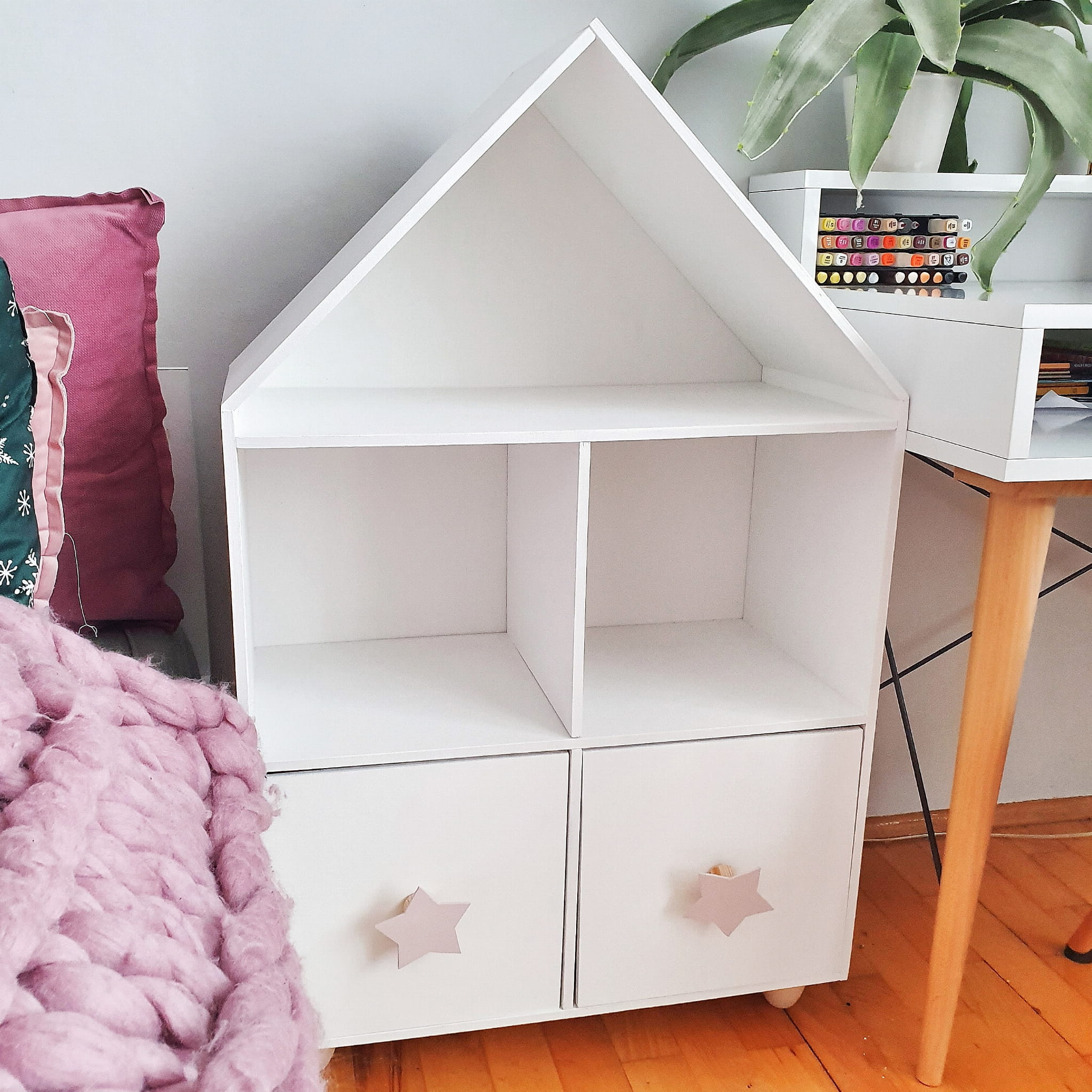 Drewniany regał domek z szufladami i uchwytami gwiazdkami