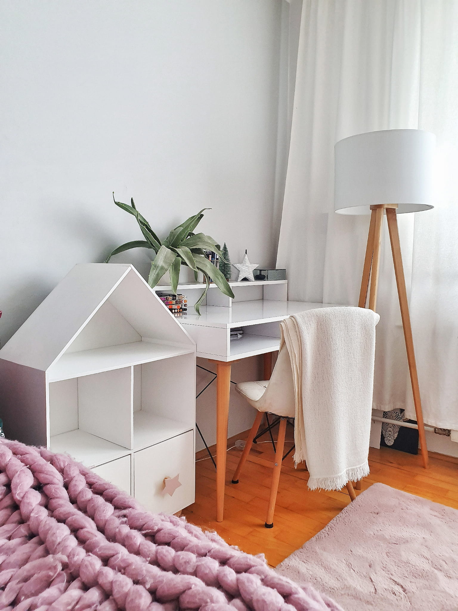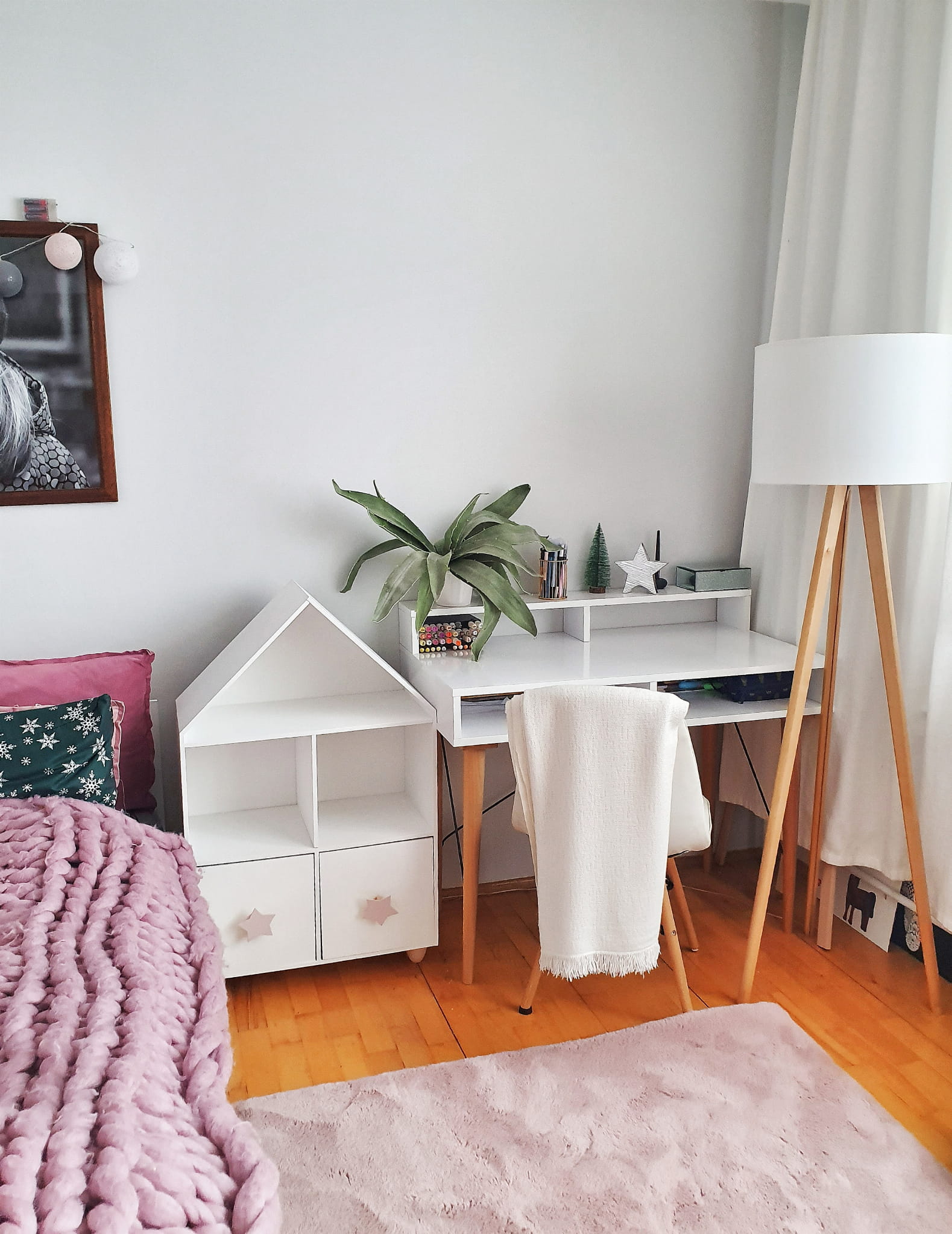 Półka regał na książki i zabawki w kształcie domku wykonany z drewnianej sklejki sosnowej z nóżkami z drewna bukowego. Regał pomalowany w kolorze białym wodorozcieńczalną emalią akrylową rekomendowaną przez Polskie Towarzystwo Alergologiczne bezpieczne i przeznaczone dla najmłodszych, nóżki pomalowane ochronnym bezbarwnym lakierem. Regał posiada 2 szuflady z uchwytami w kształcie gwiazdek w kolorze pudrowego różu