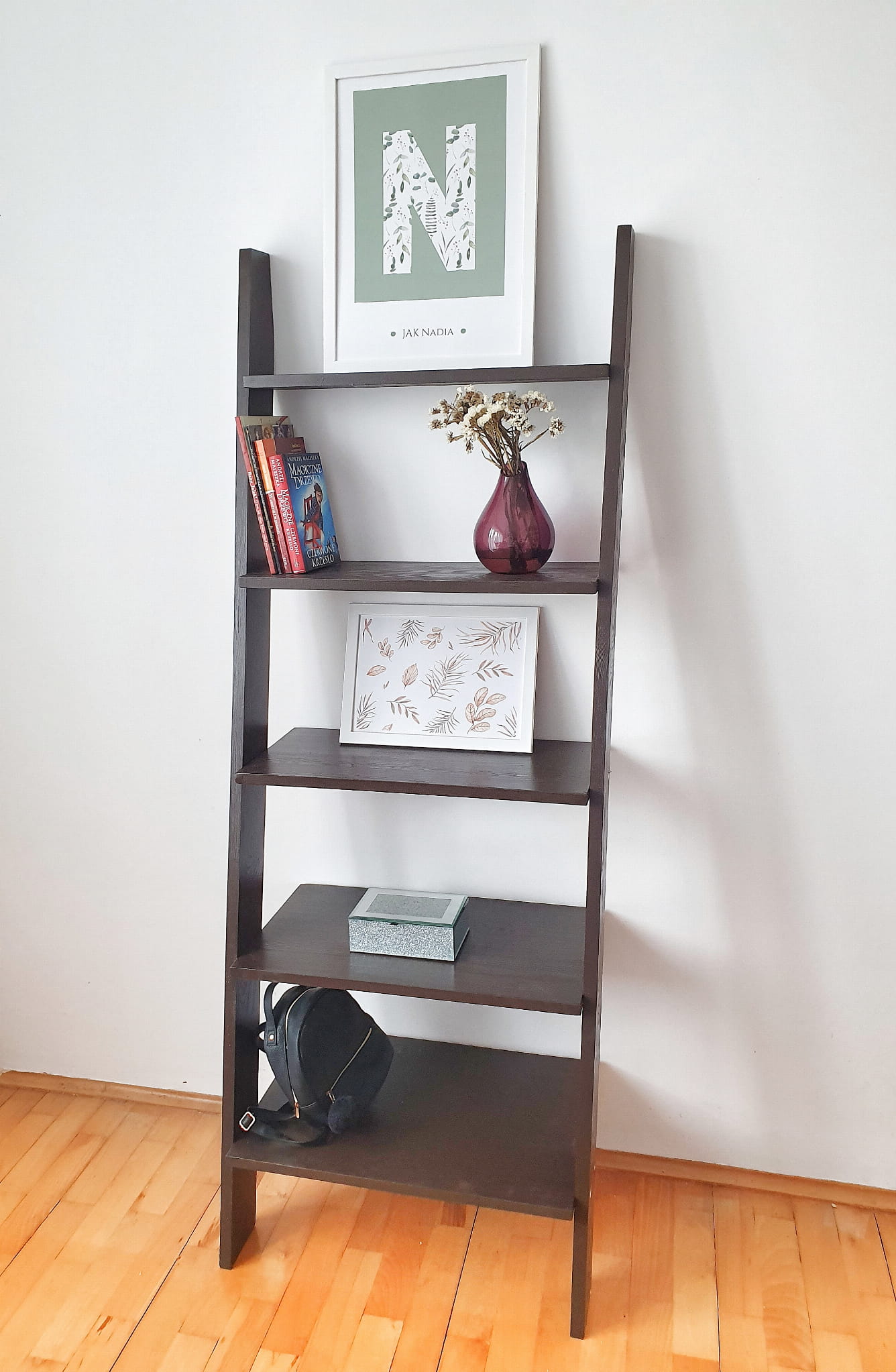Wymiary: wysokość 160 cm, szerokość całkowita 59 cm szerokość półki 55 cm głębokość największej półki 38 cm głębokość najmniejszej 14 cm