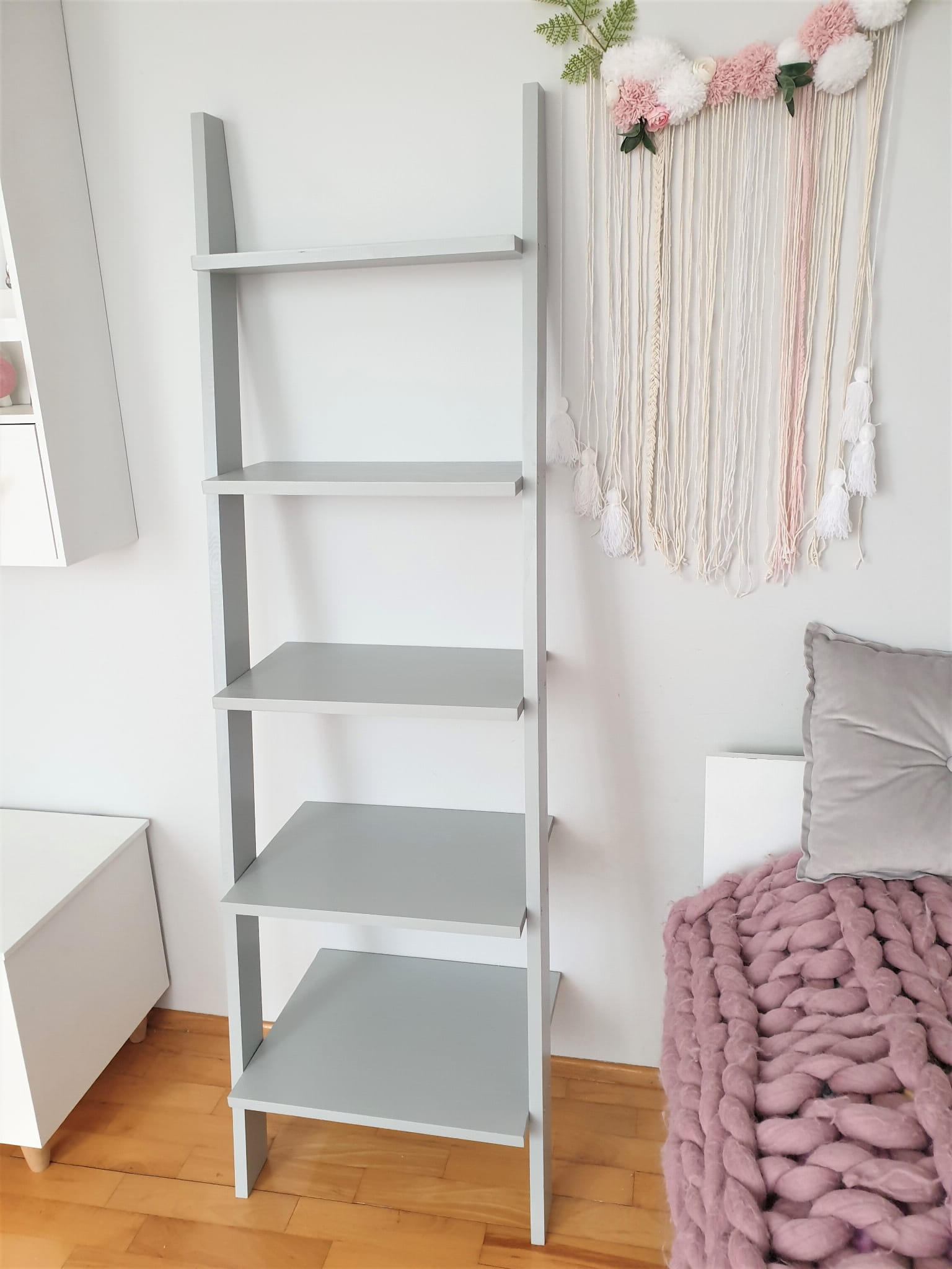 Drewniany regał półka drabinka jasno szara