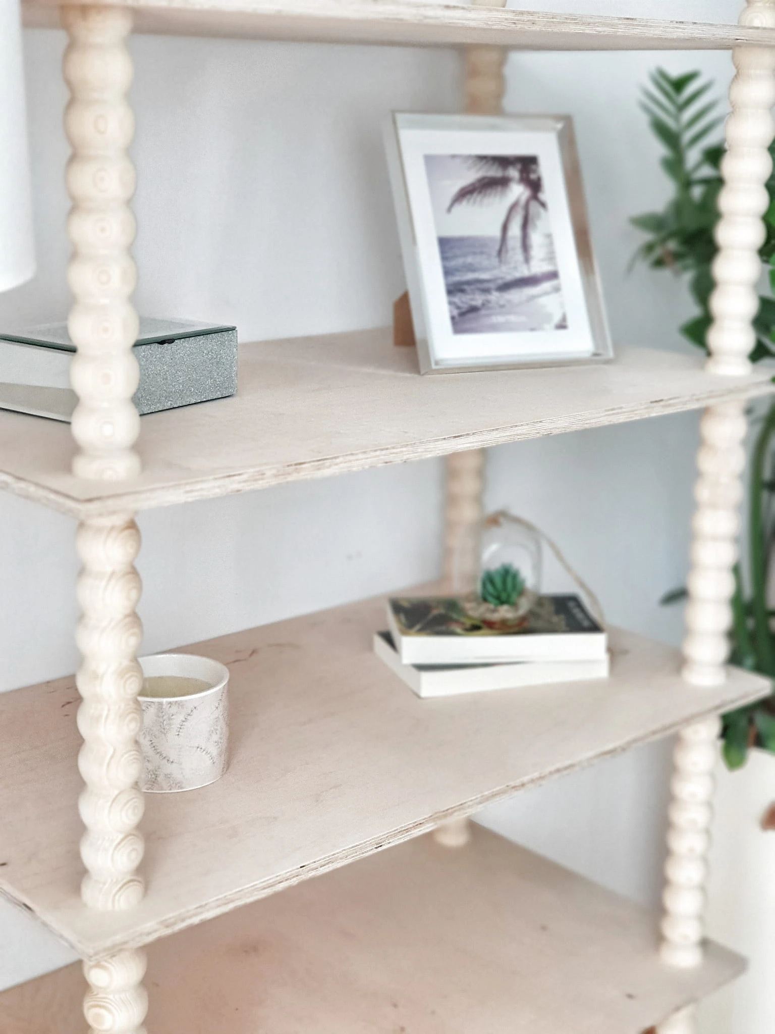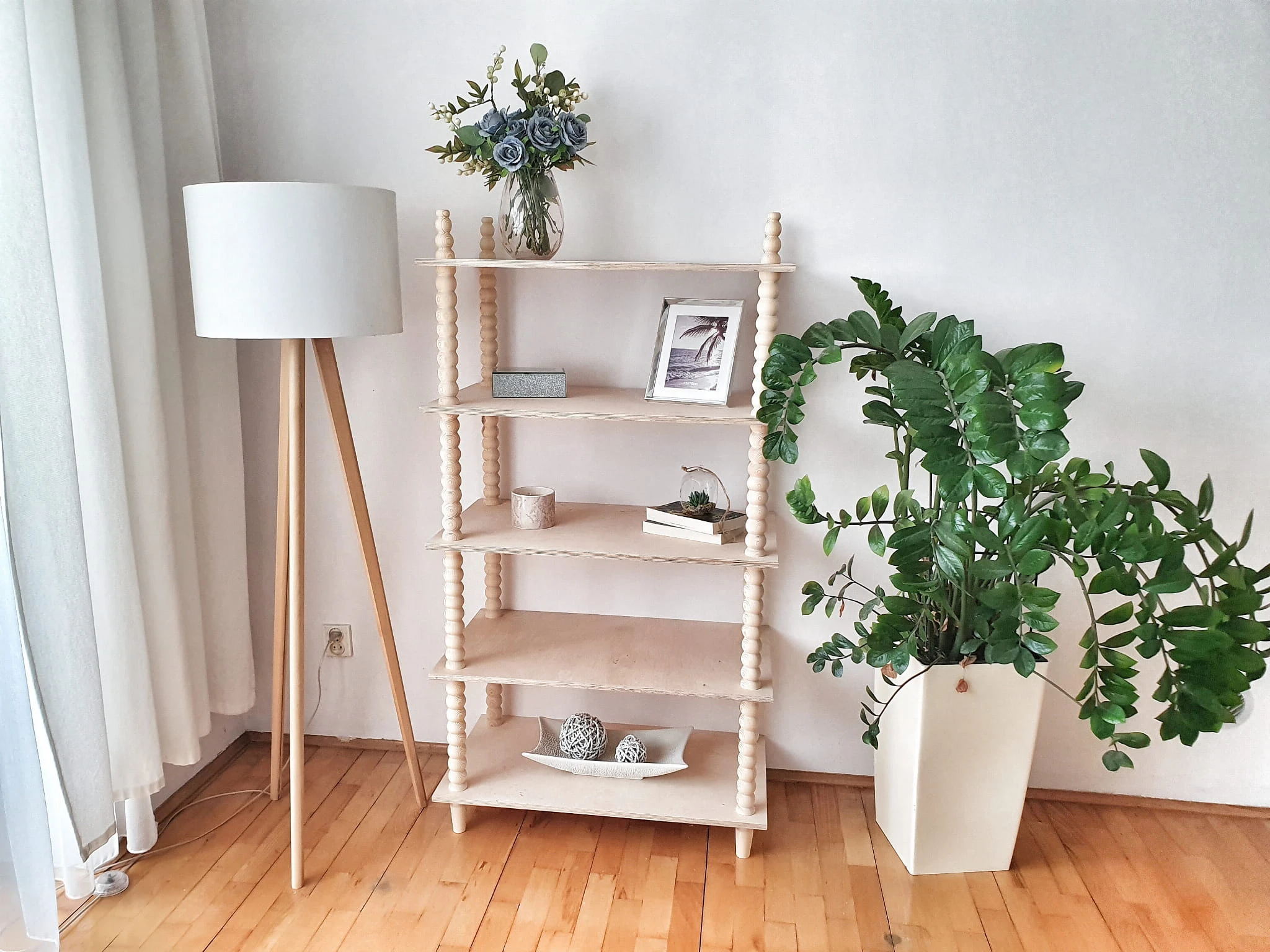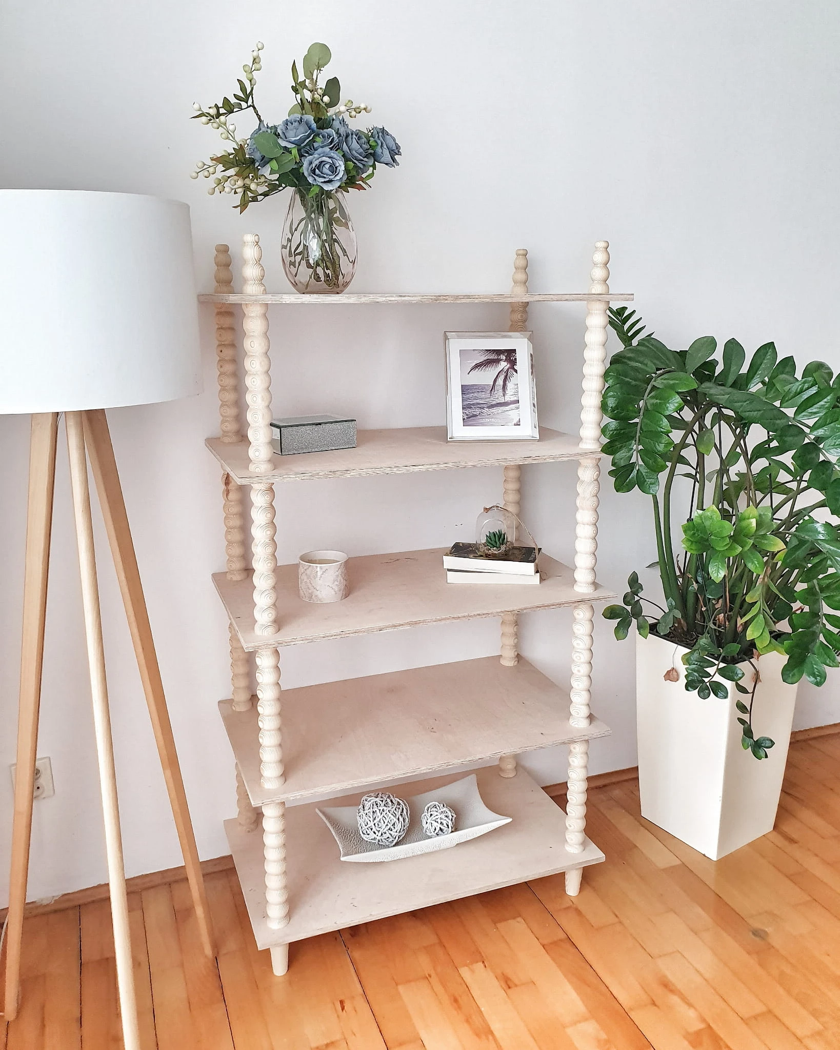 Półka regał na książki i zabawki w kształcie prostokąta z ozdobnymi toczonymi nóżkami wykonany z drewnianej sklejki sosnowej z nóżkami z drewna sosnowego.