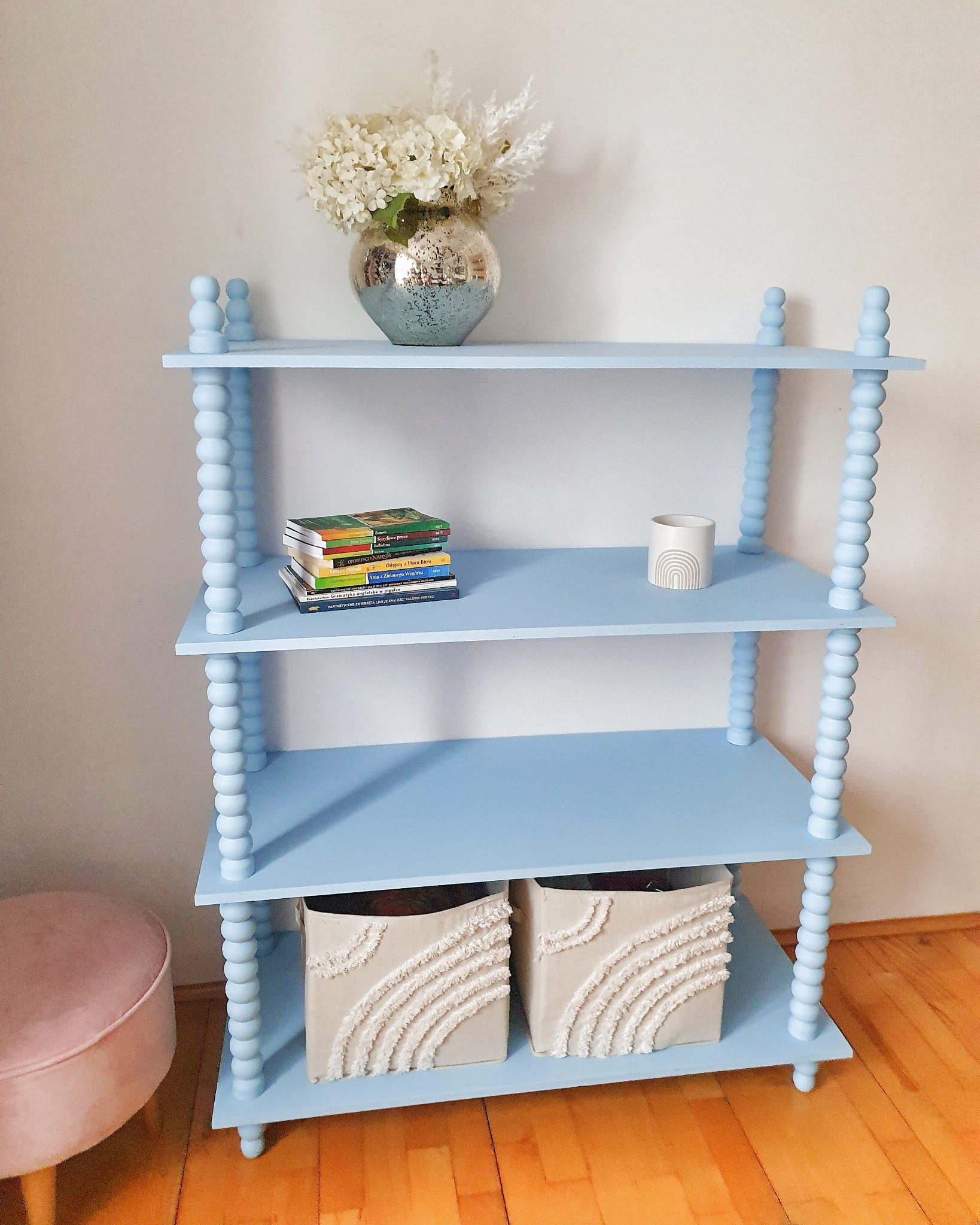 Drewniany regał z ozdobnymi nóżkami błękitny