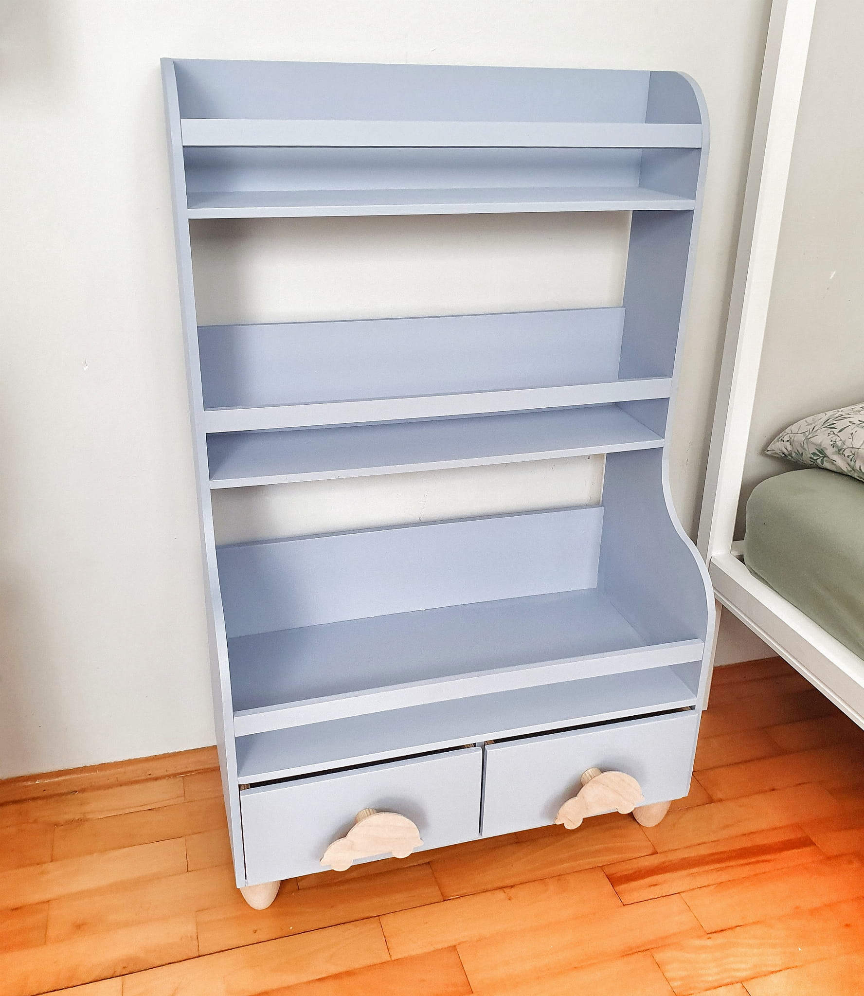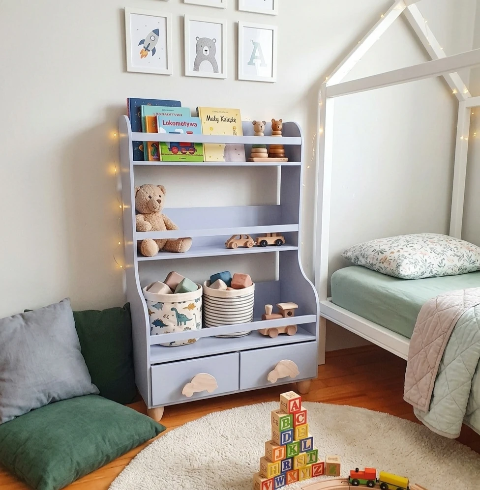 Drewniany stojący regał, biblioteczka dla dzieci z szufladkami niebieski uchwyty autka