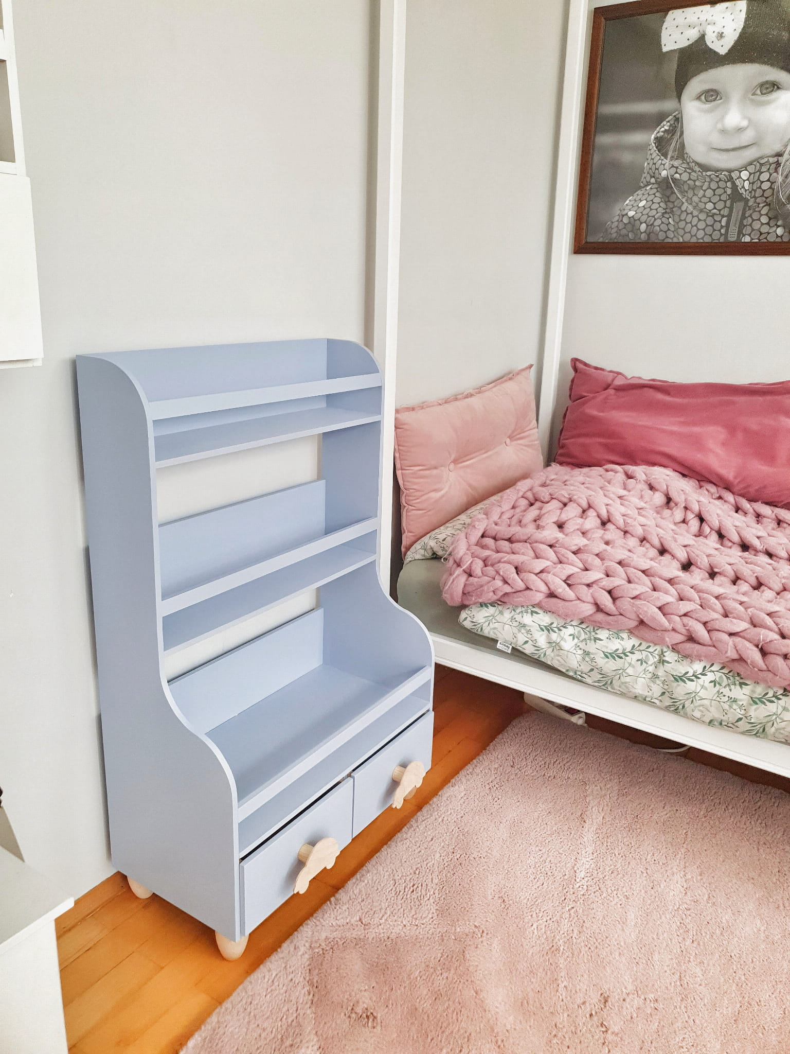 Półka regał na książki i zabawki wykonany z drewnianej sklejki sosnowej z nóżkami z drewna bukowego. Regał pomalowany w kolorze niebieskim wodorozcieńczalną emalią akrylową rekomendowaną przez Polskie Towarzystwo Alergologiczne bezpieczne i przeznaczone dla najmłodszych, nóżki pomalowane ochronnym bezbarwnym lakierem. Regał posiada 2 szufladki z drewnianymi uchytami w kształcie autka.