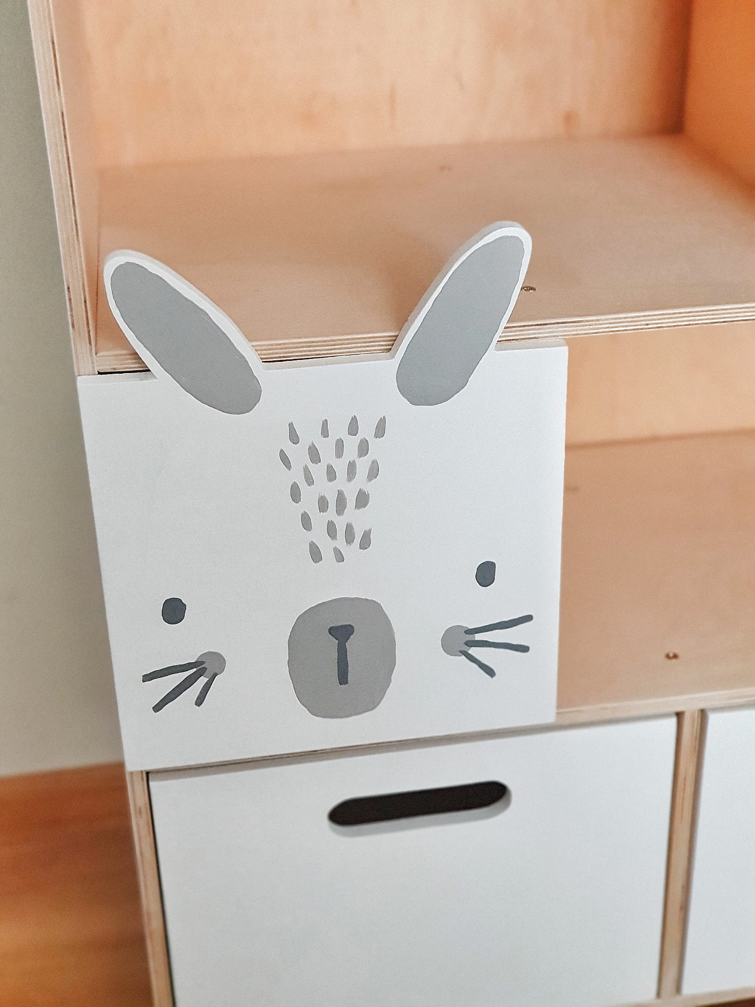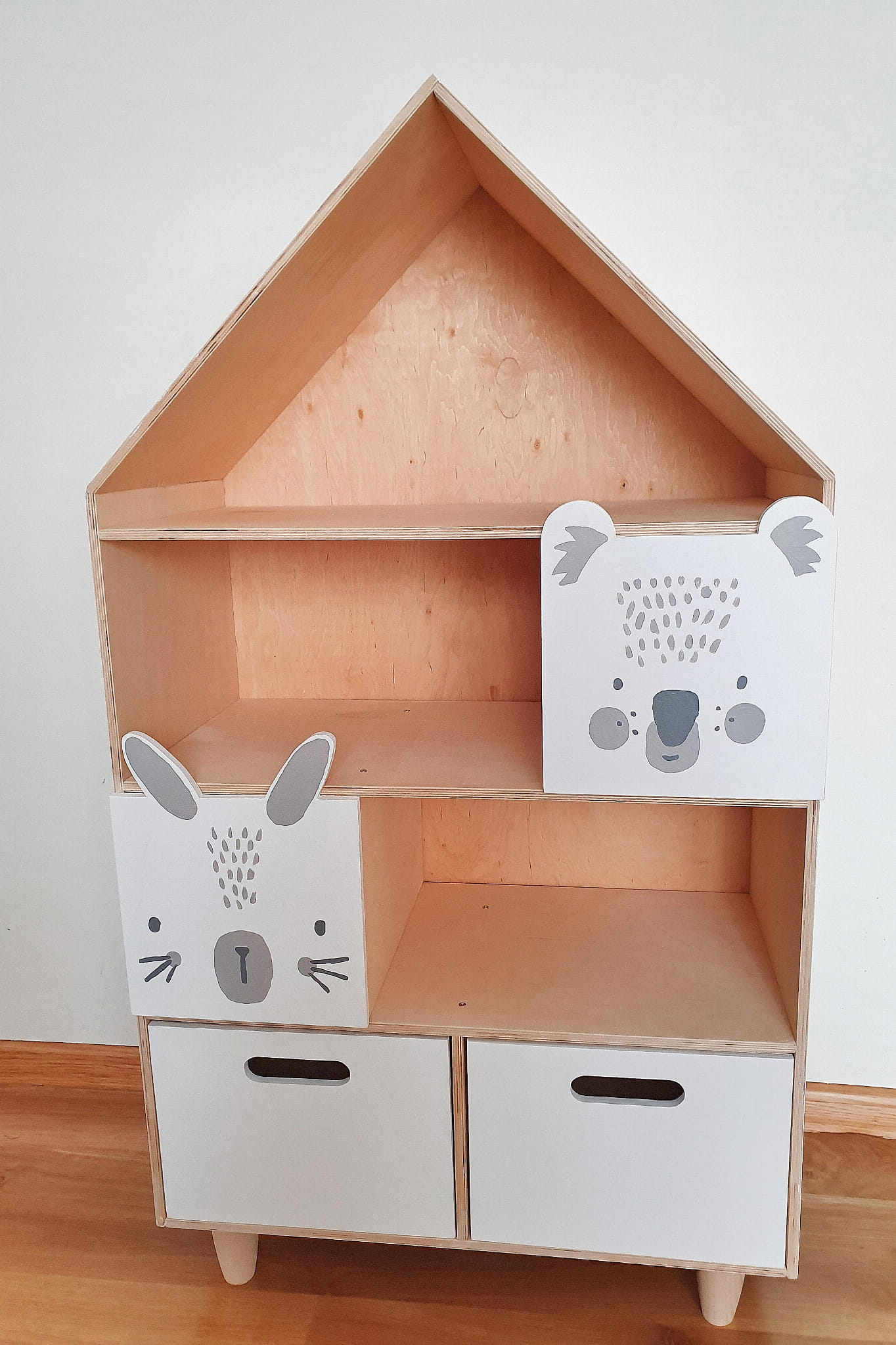 Półka regał na książki i zabawki w kształcie domku wykonany z drewnianej sklejki sosnowej z nóżkami z drewna bukowego. Regał pomalowany z zewnątrz w kolorze białym wodorozcieńczalną emalią akrylową rekomendowaną przez Polskie Towarzystwo Alergologiczne bezpieczne i przeznaczone dla najmłodszych, nóżki oraz środek pomalowane ochronnym bezbarwnym lakierem. Regał posiada 4 szuflady. 2 z ręcznie malowanym motywem zwierzątek oraz 2 z wyciętym otworem.