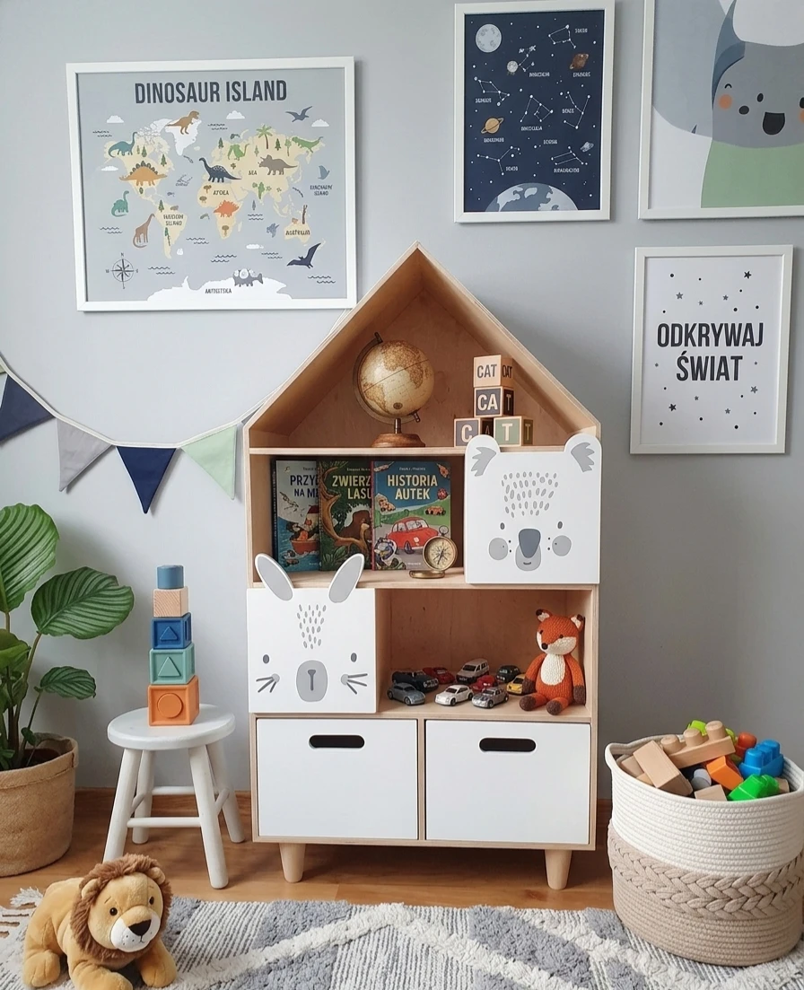 Drewniany stojący regał dla dzieci domek z ozdobnymi szufladkami