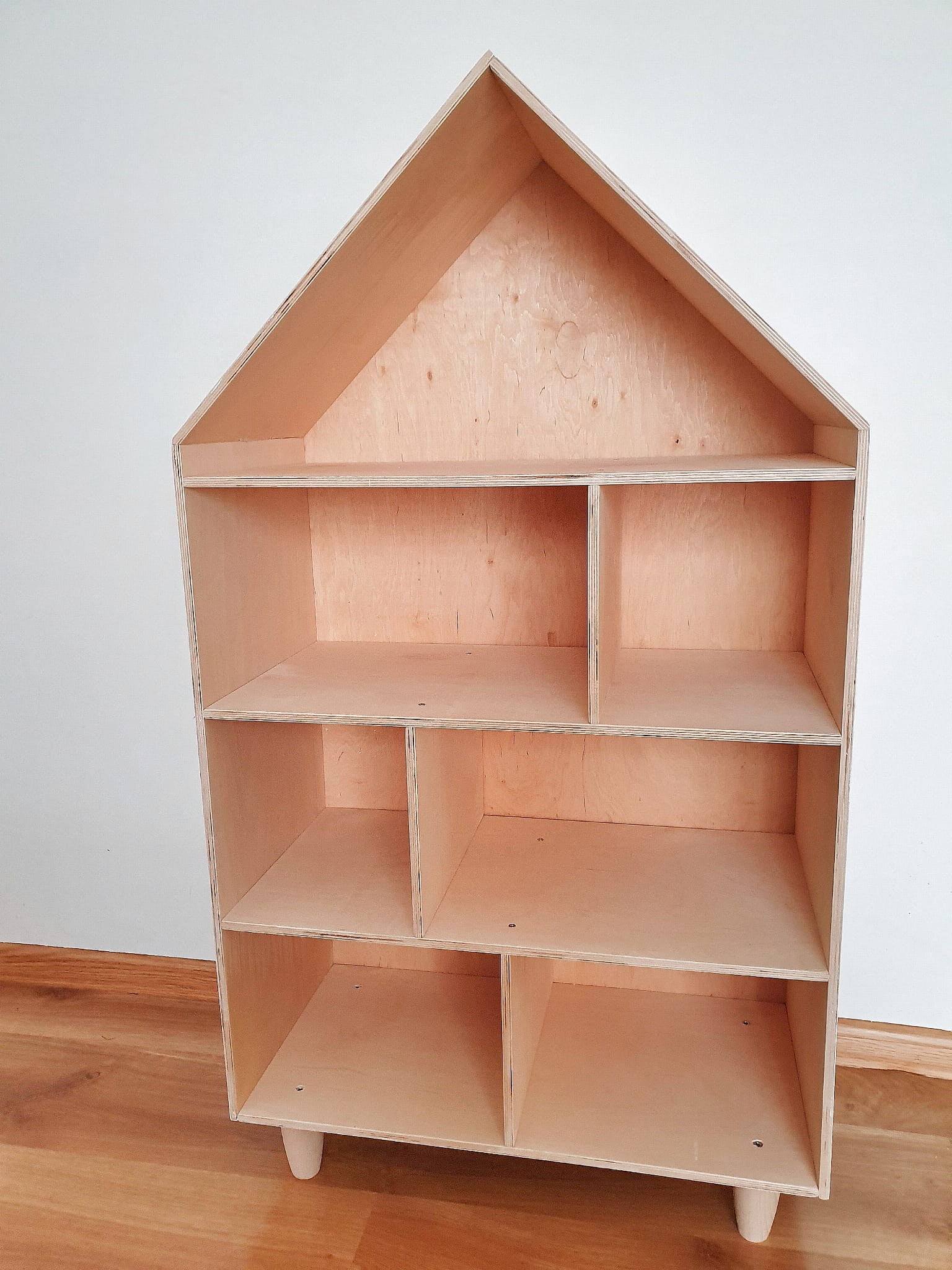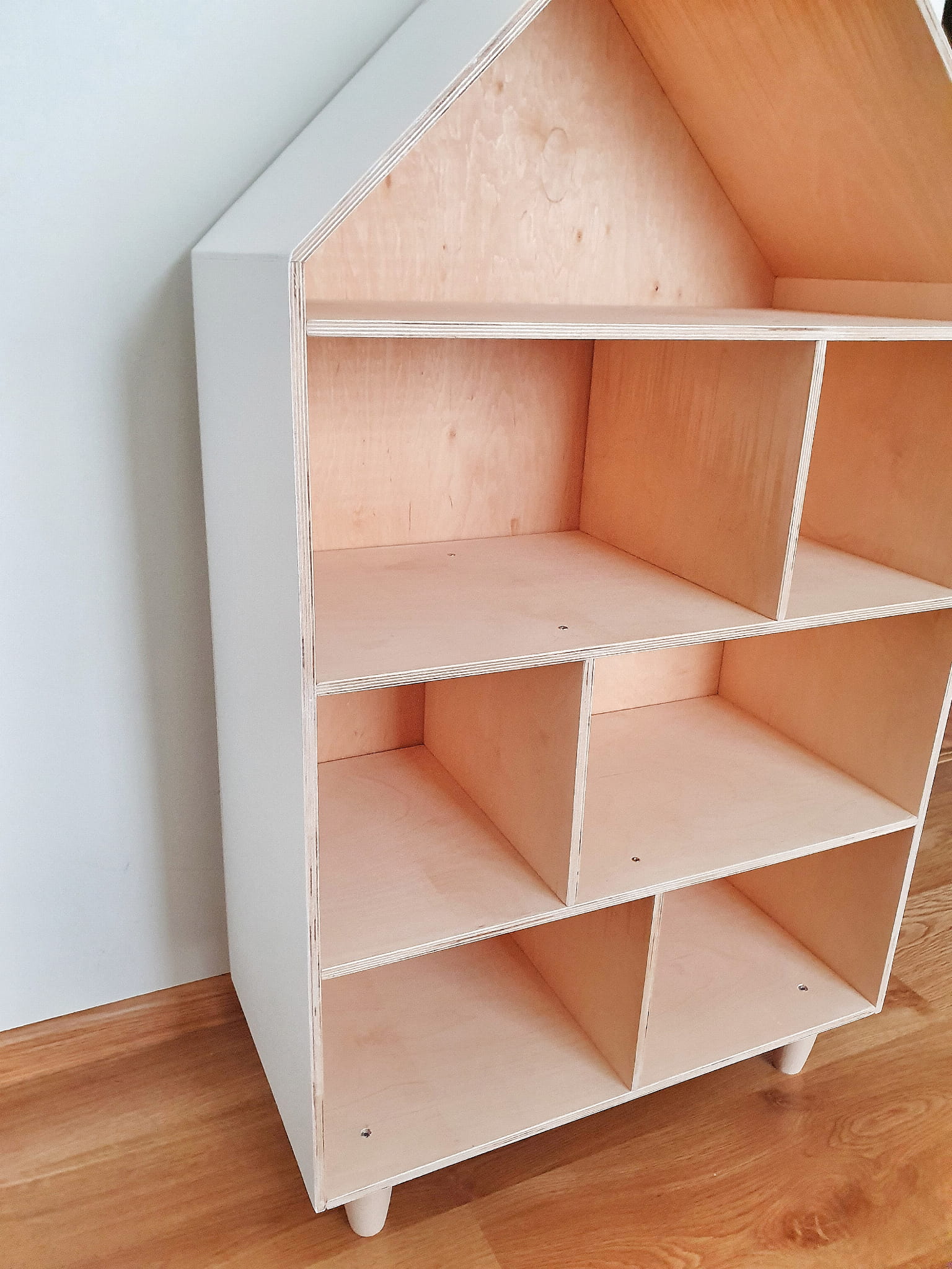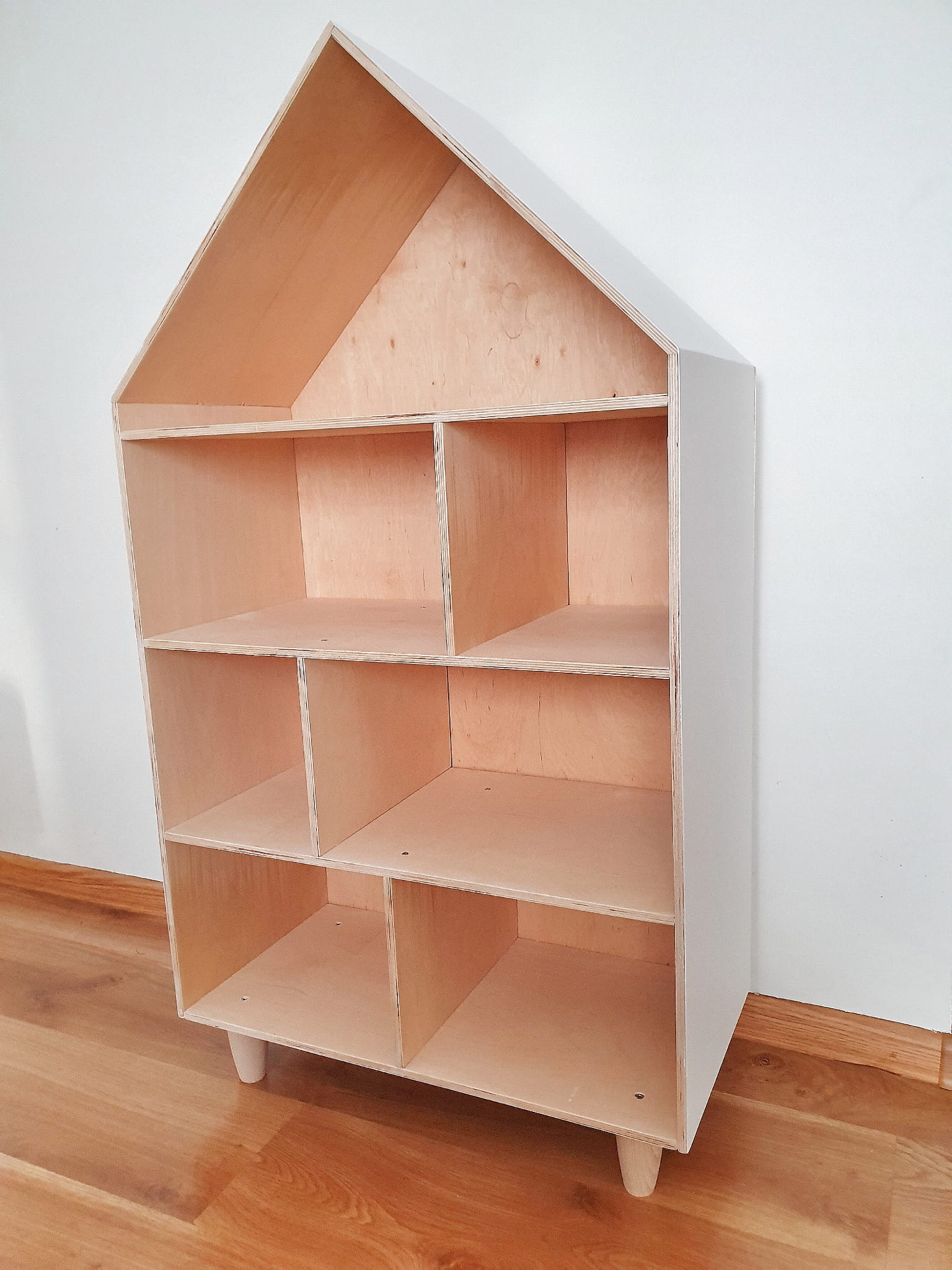 Półka regał na książki i zabawki w kształcie domku wykonany z drewnianej sklejki sosnowej z nóżkami z drewna bukowego. Regał pomalowany z zewnątrz w kolorze białym wodorozcieńczalną emalią akrylową rekomendowaną przez Polskie Towarzystwo Alergologiczne bezpieczne i przeznaczone dla najmłodszych, nóżki oraz środek pomalowane ochronnym bezbarwnym lakierem.