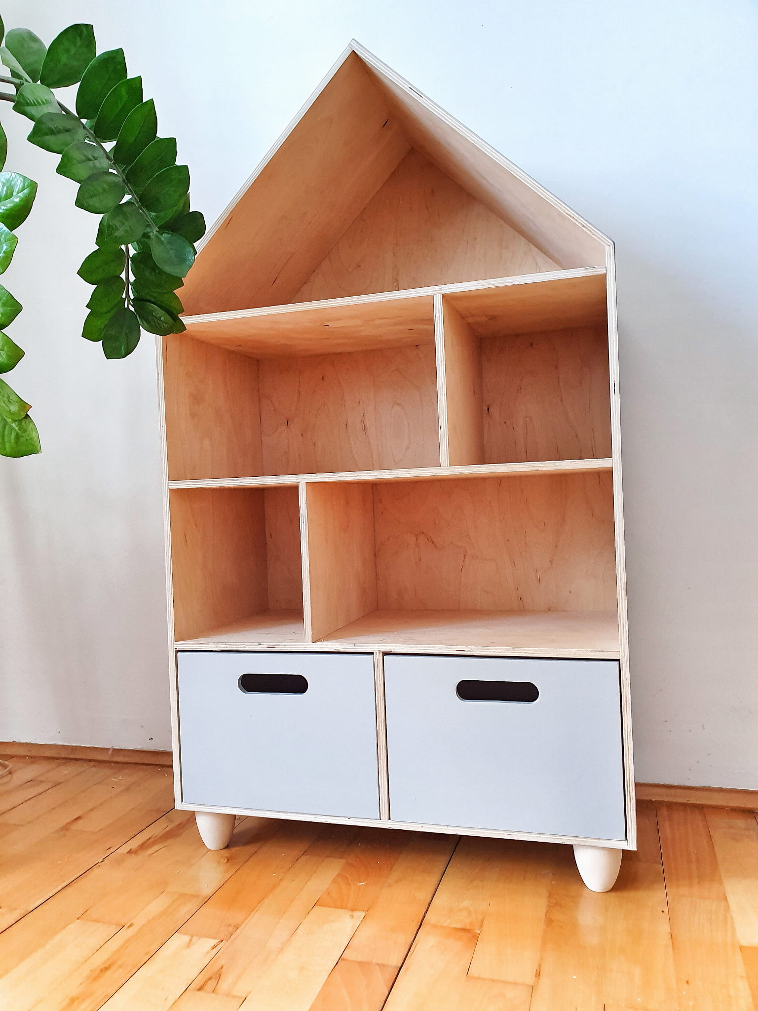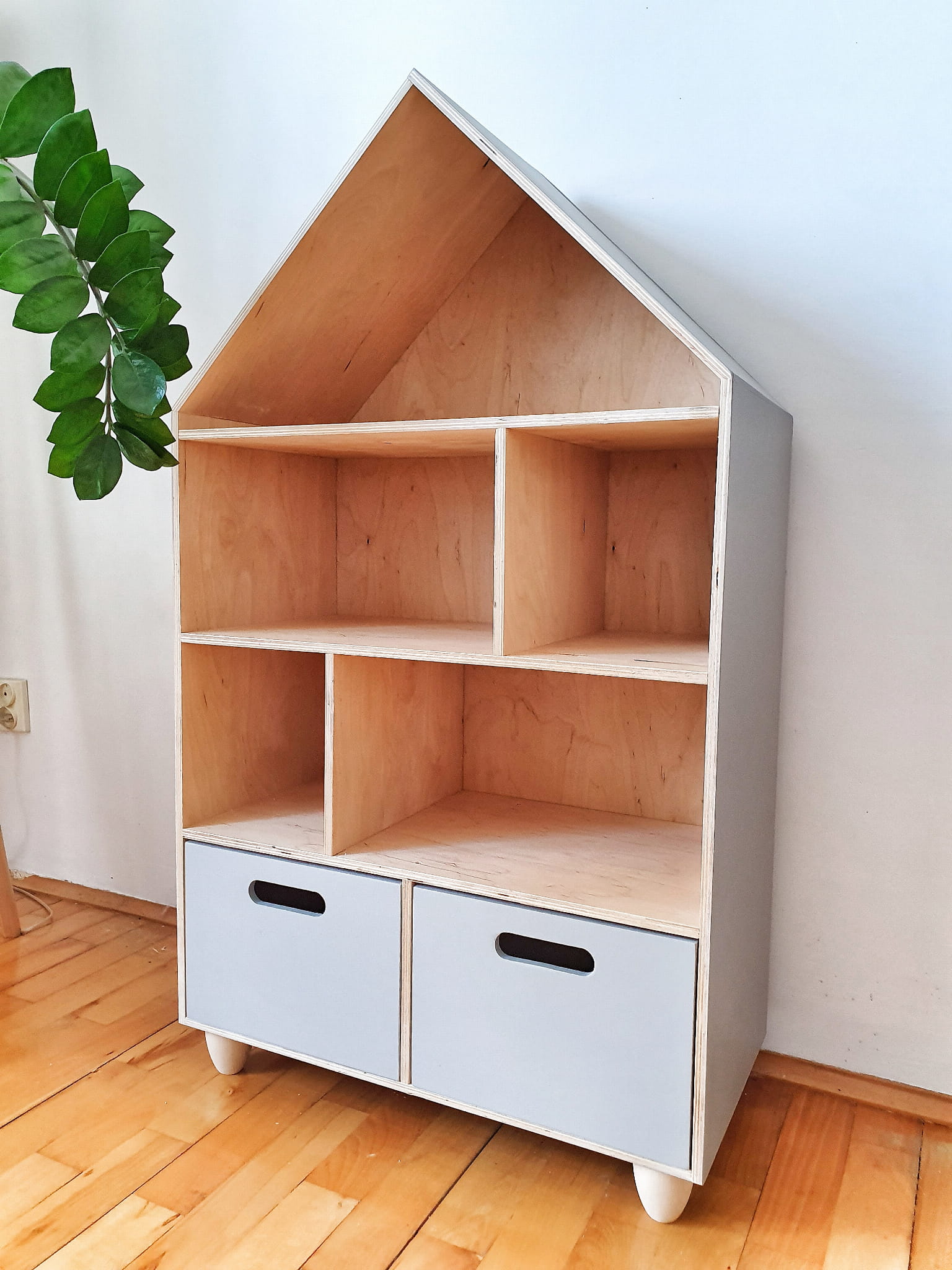 Półka regał na książki i zabawki w kształcie domku wykonany z drewnianej sklejki sosnowej z nóżkami z drewna bukowego. Regał pomalowany z zewnątrz w kolorze szarym wodorozcieńczalną emalią akrylową rekomendowaną przez Polskie Towarzystwo Alergologiczne bezpieczne i przeznaczone dla najmłodszych, nóżki oraz środek pomalowane ochronnym bezbarwnym lakierem. Regał posiada 2 szuflady. 2 szare szuflady z wyciętym otworem.