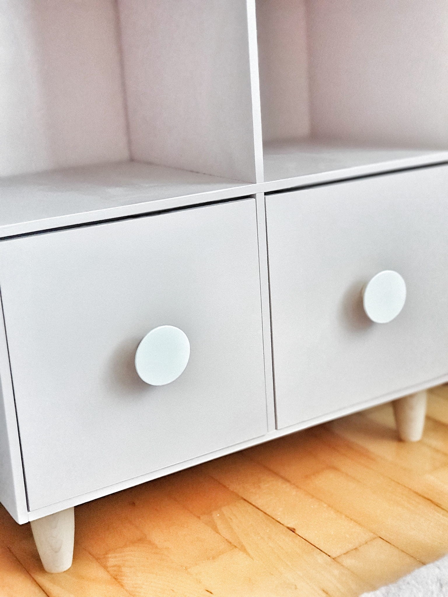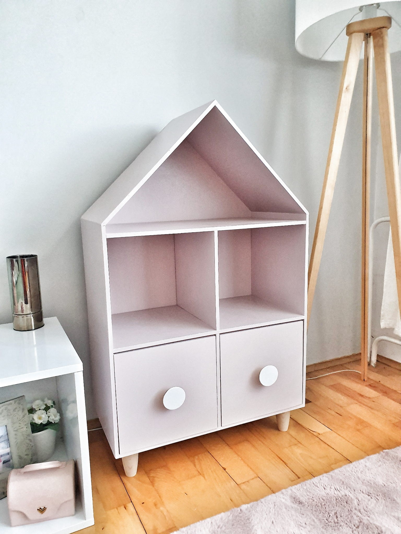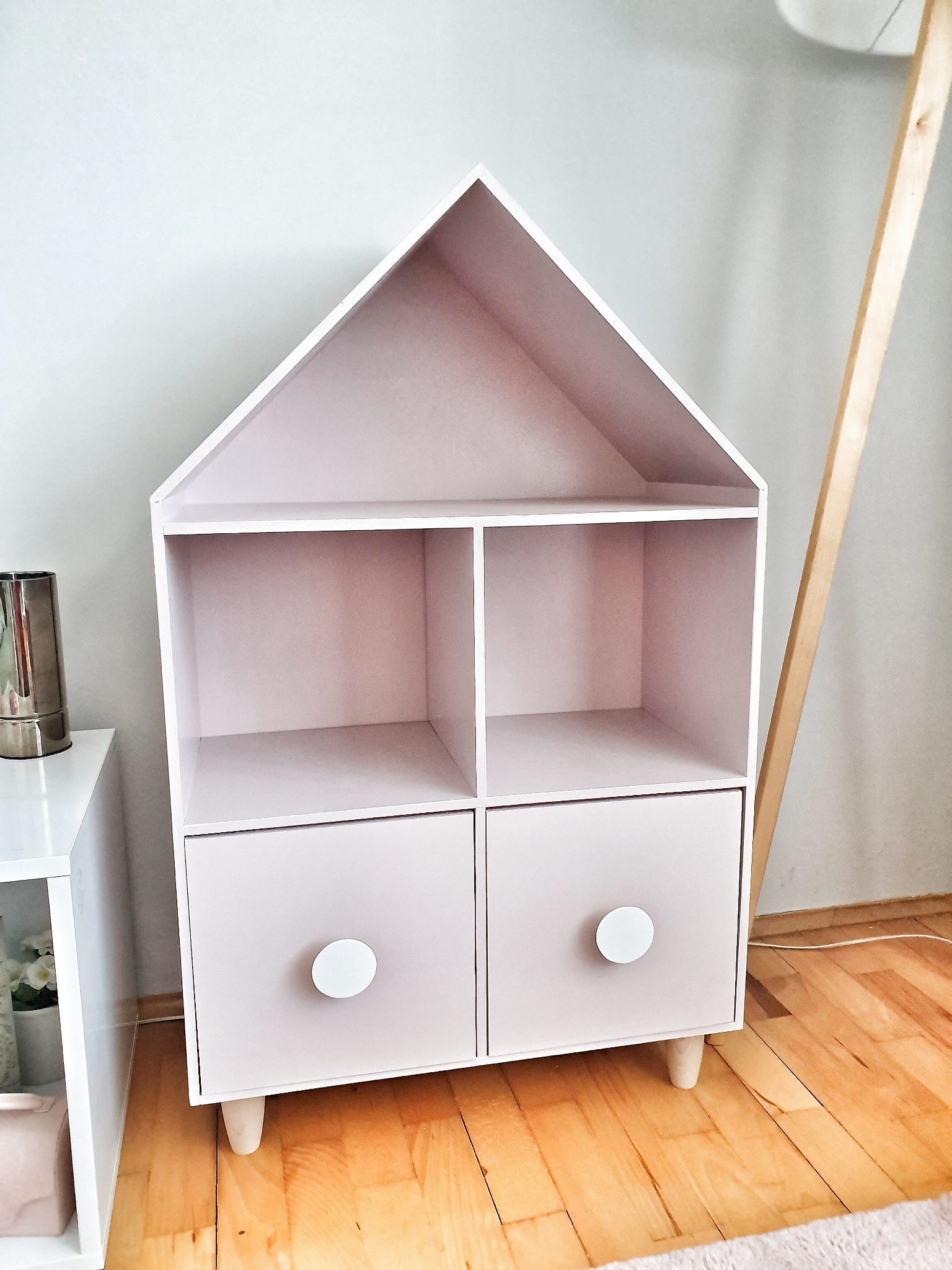 Półka regał na książki i zabawki w kształcie domku wykonany z drewnianej sklejki sosnowej z nóżkami z drewna bukowego. Regał pomalowany w kolorze pudrowy róż wodorozcieńczalną emalią akrylową rekomendowaną przez Polskie Towarzystwo Alergologiczne bezpieczne i przeznaczone dla najmłodszych, nóżki pomalowane ochronnym bezbarwnym lakierem. Regał posiada 2 szuflady z uchwytami w kształcie koła w kolorze białym
