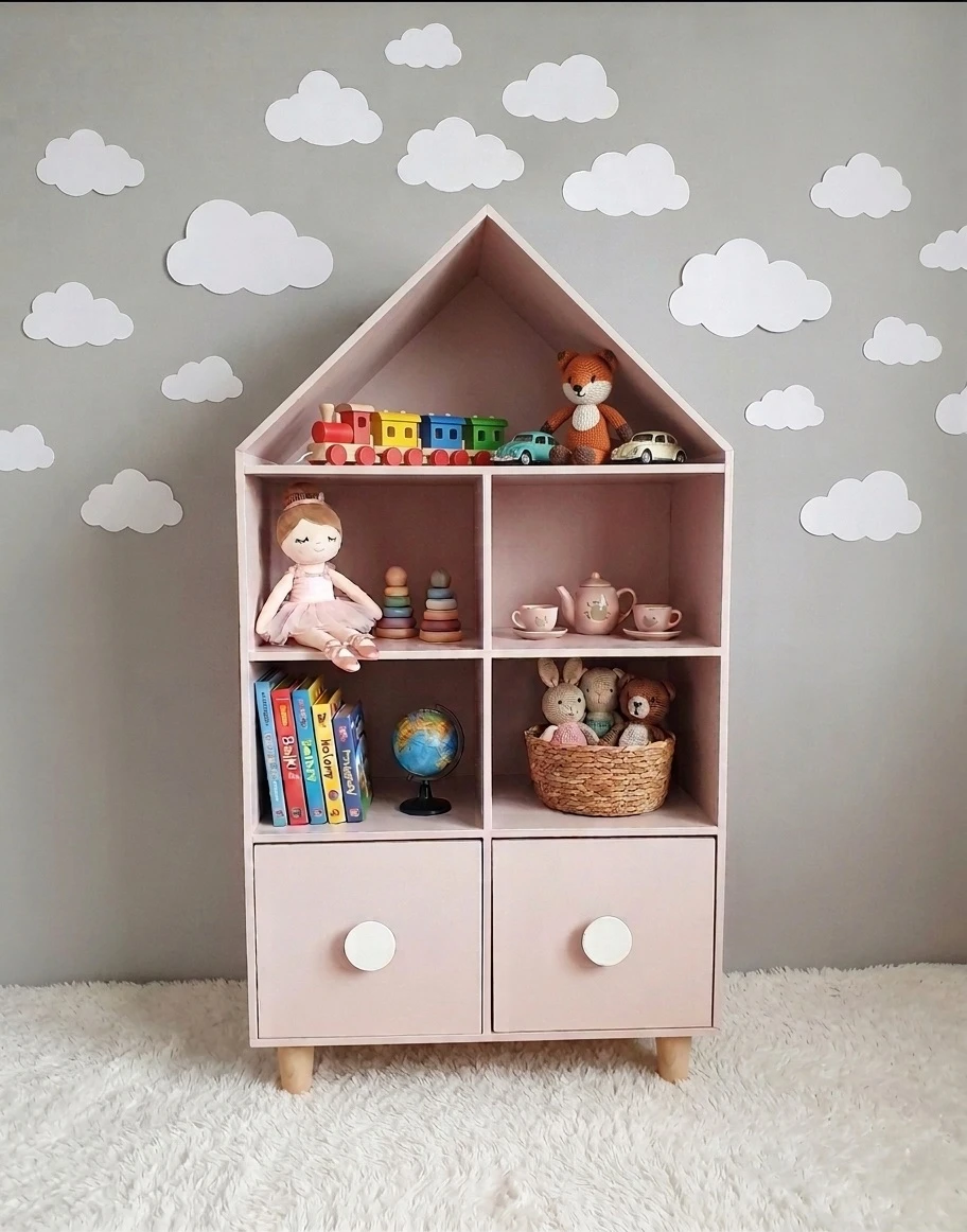 Drewniany stojący regał dla dzieci w kształcie domku z szufladkami pudrowy róż