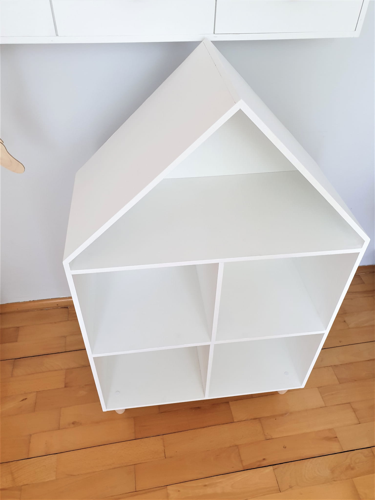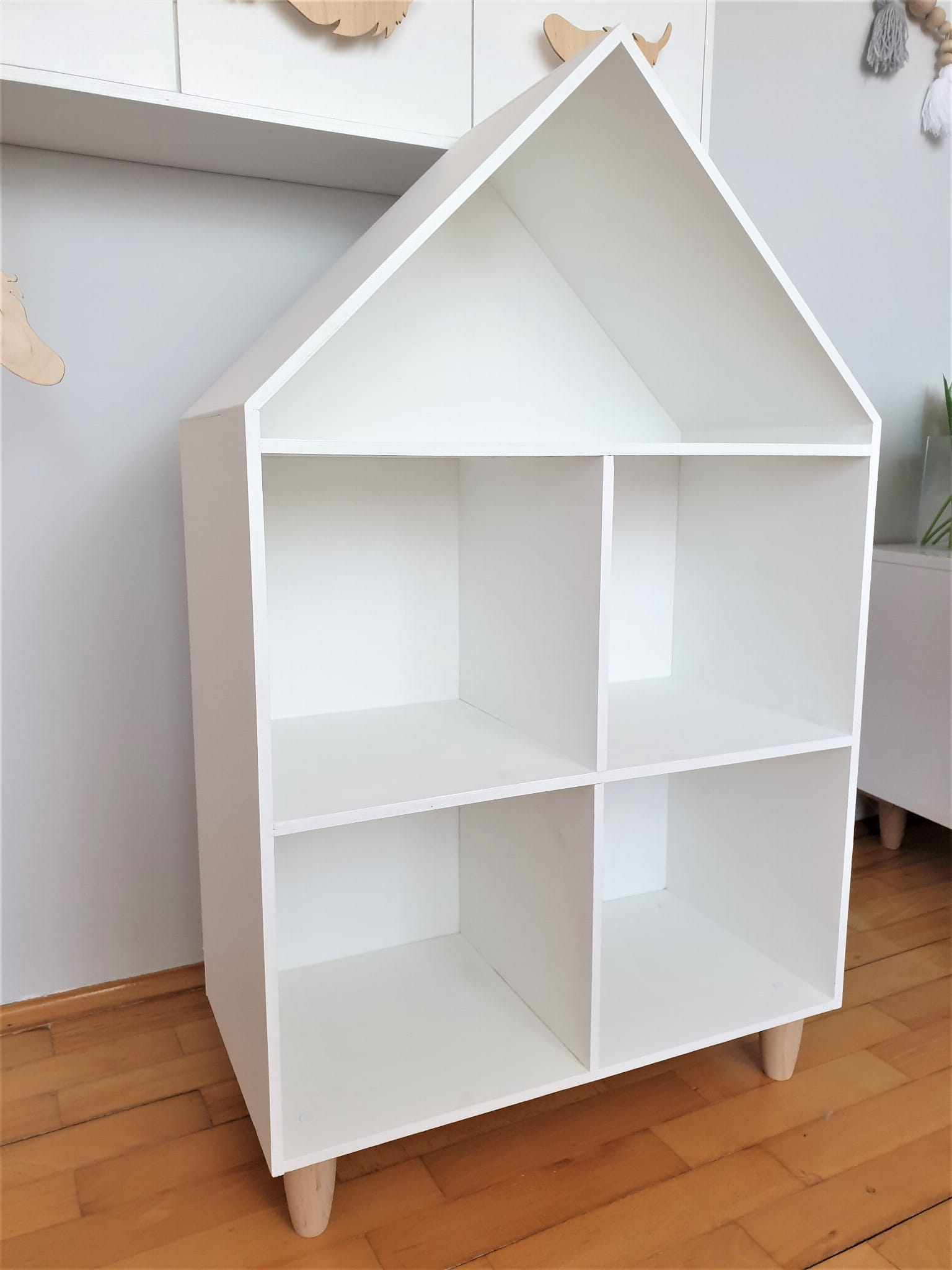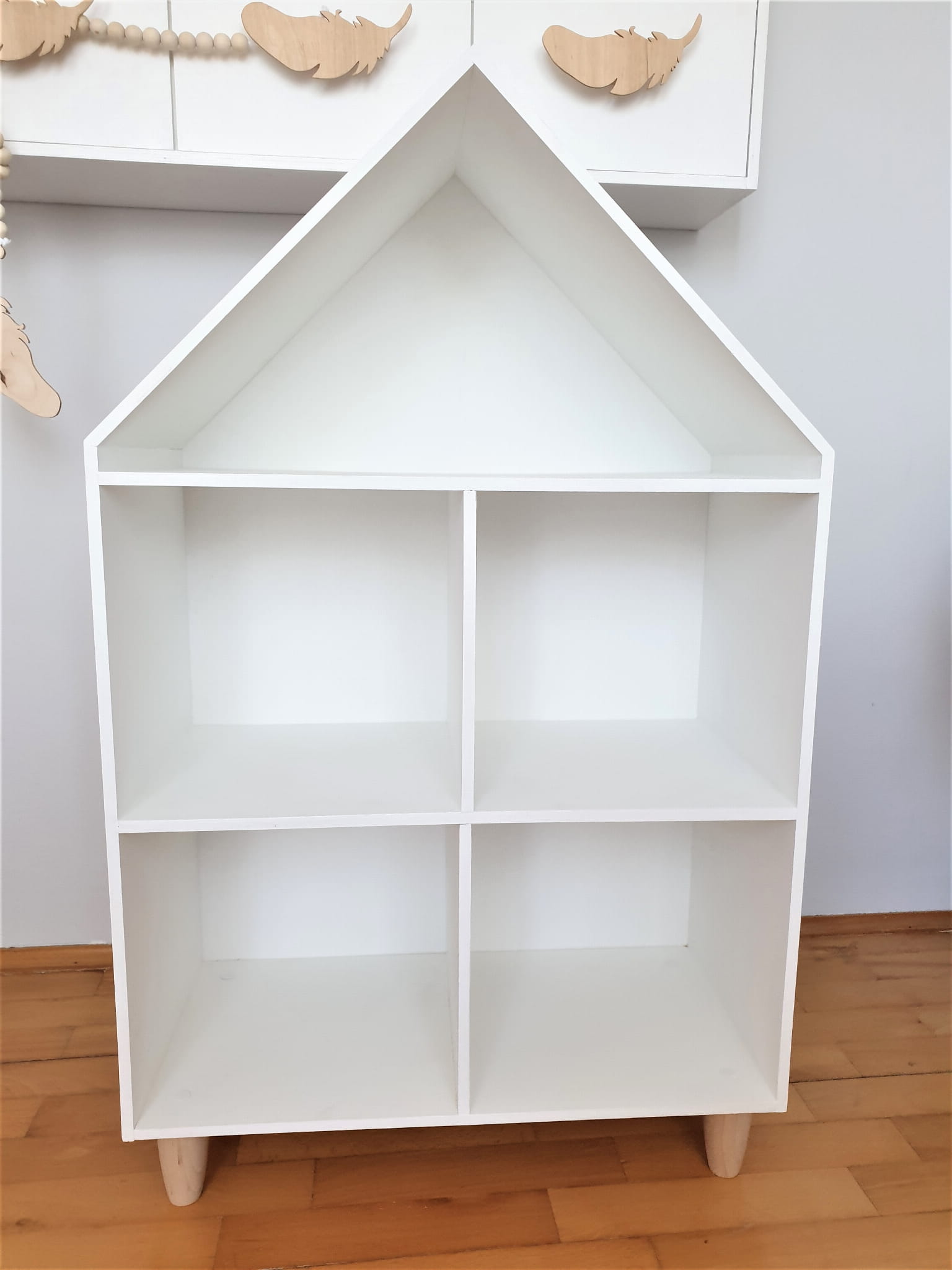 Półka regał na książki i zabawki w kształcie domku wykonany z drewnianej sklejki sosnowej z nóżkami z drewna bukowego. Regał pomalowany w kolorze białym wodorozcieńczalną emalią akrylową rekomendowaną przez Polskie Towarzystwo Alergologiczne bezpieczne i przeznaczone dla najmłodszych, nóżki pomalowane ochronnym bezbarwnym lakierem.