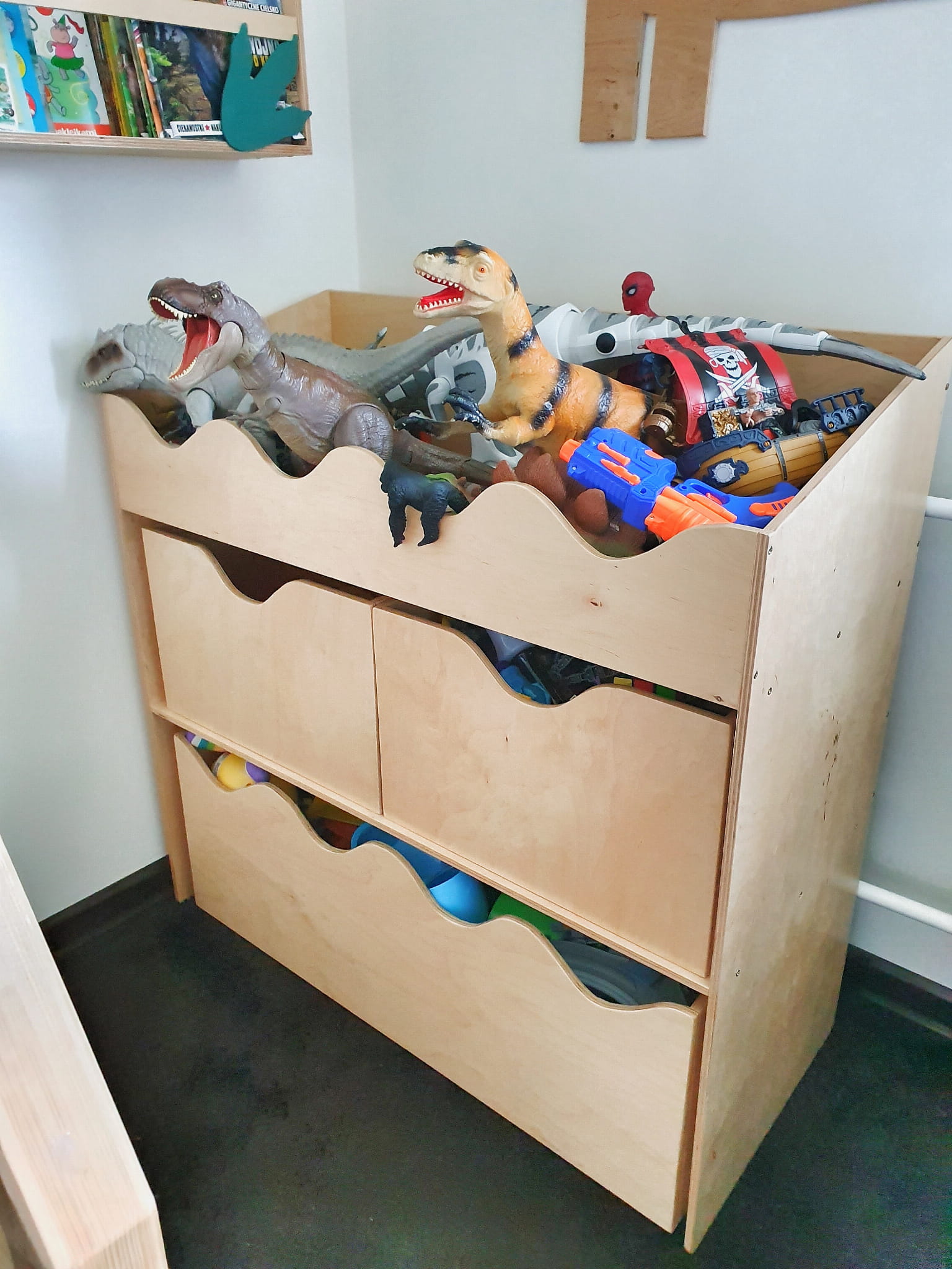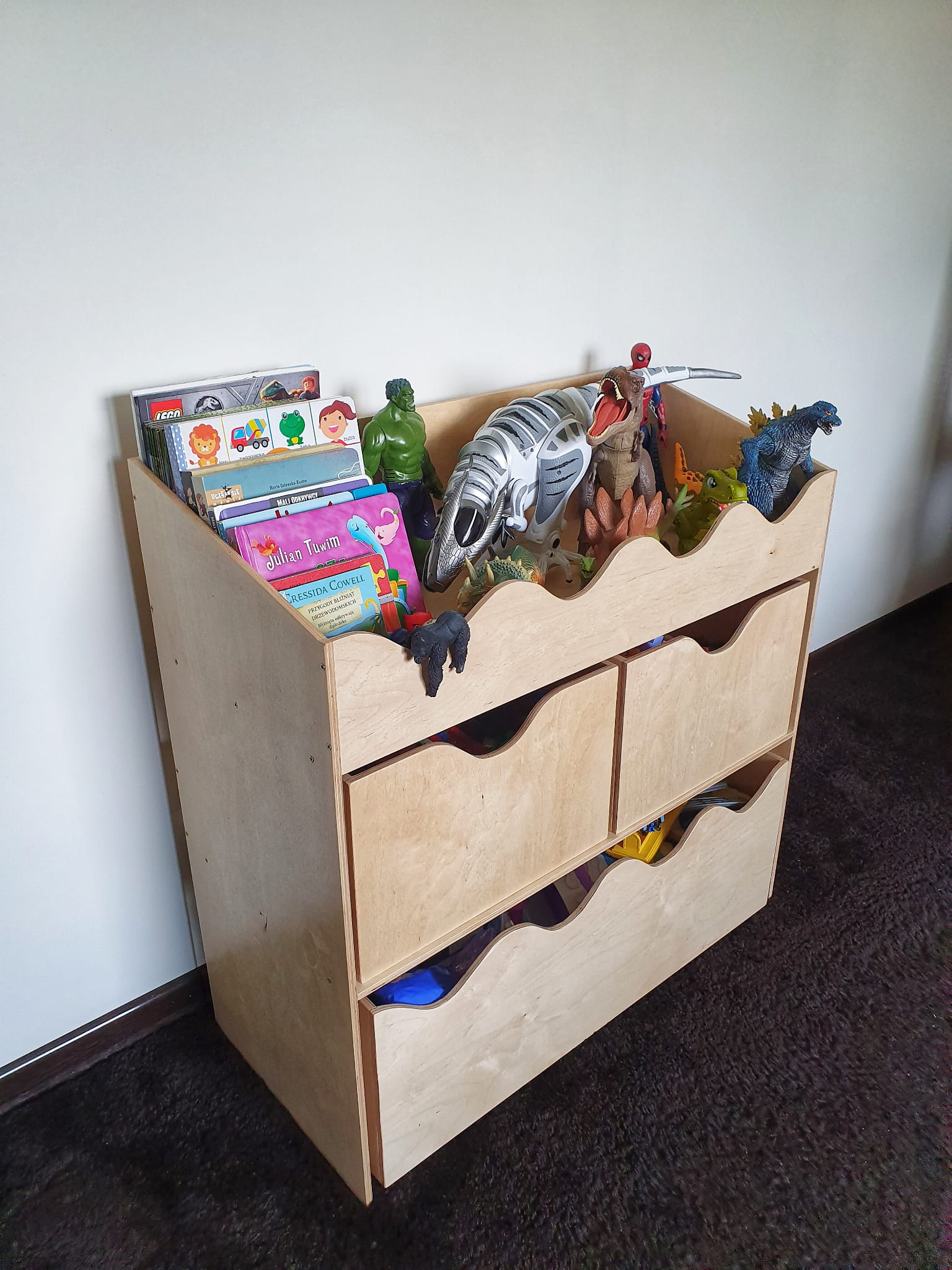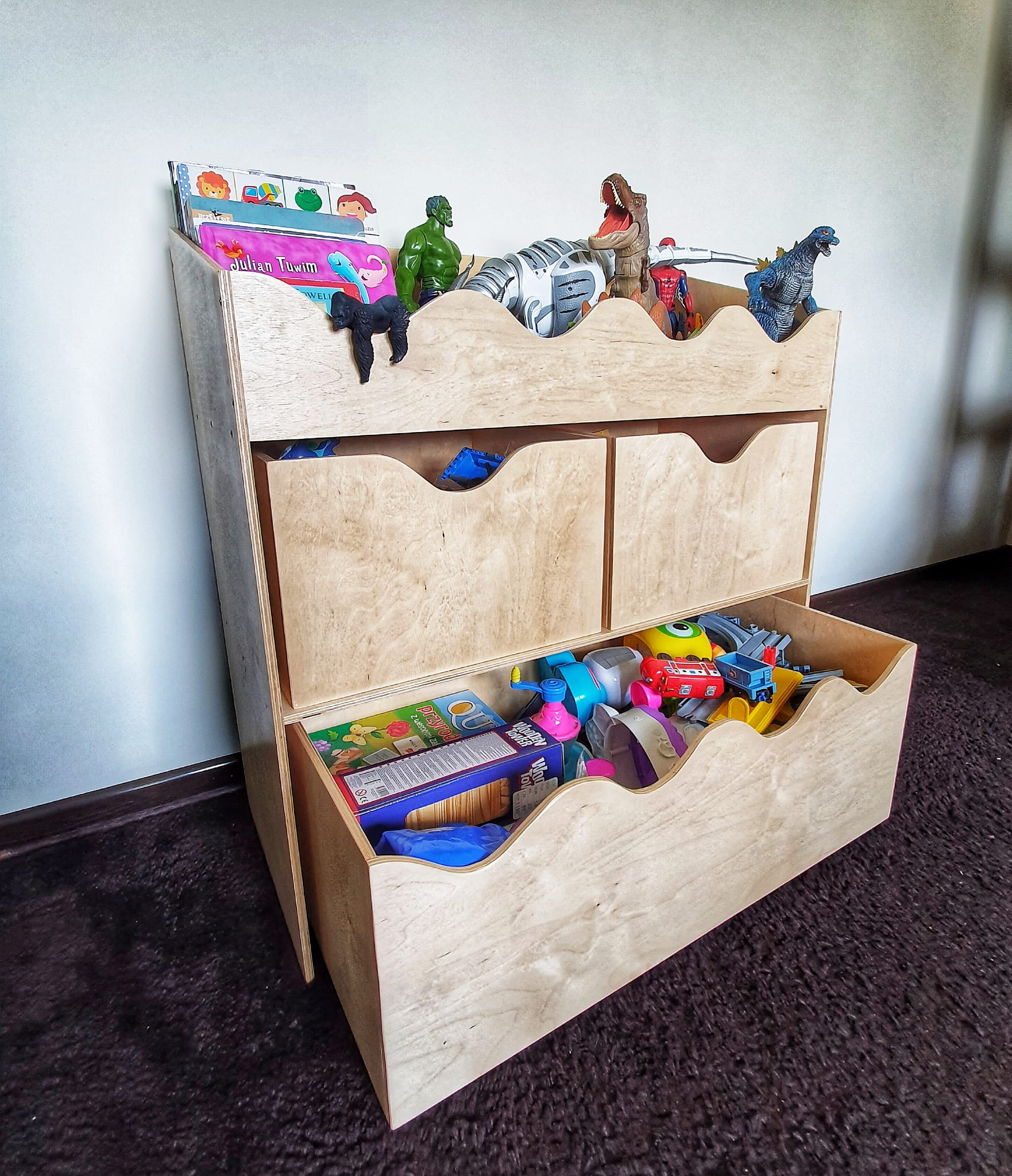 Pomieści wszystkie najpotrzebniejsze zabawki dziecka. Składa się z górnej półki, z 2 mniejszych skrzyneczek oraz jednej dużej skrzyni wysuwanej na kółkach.
