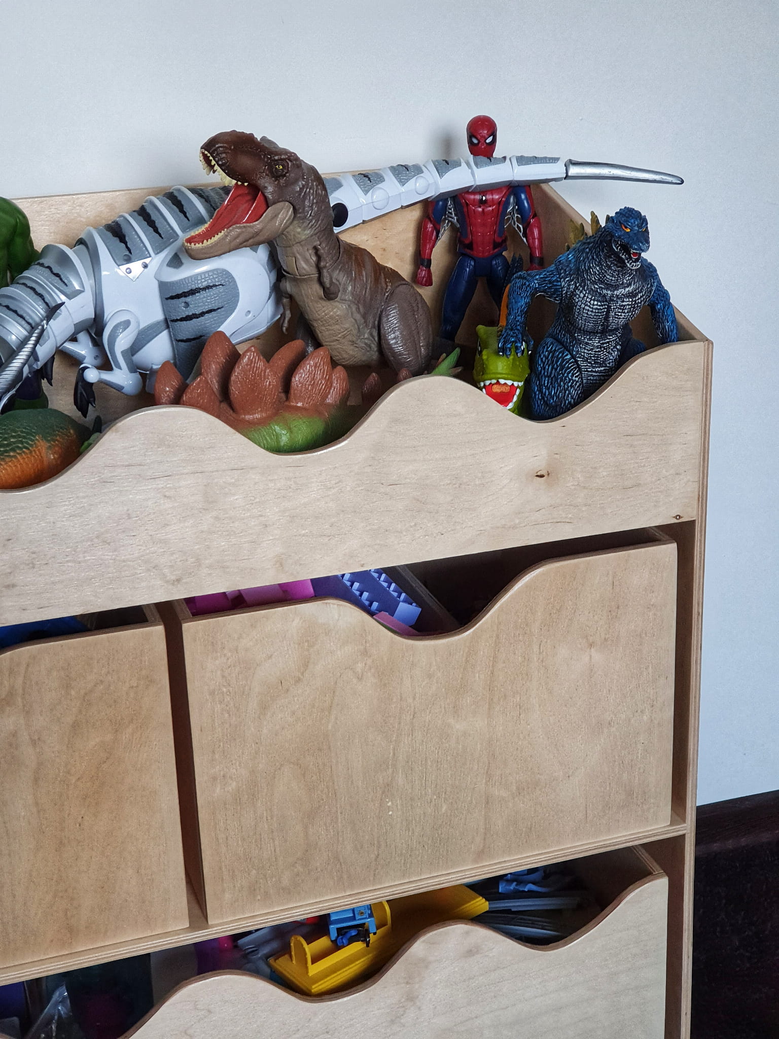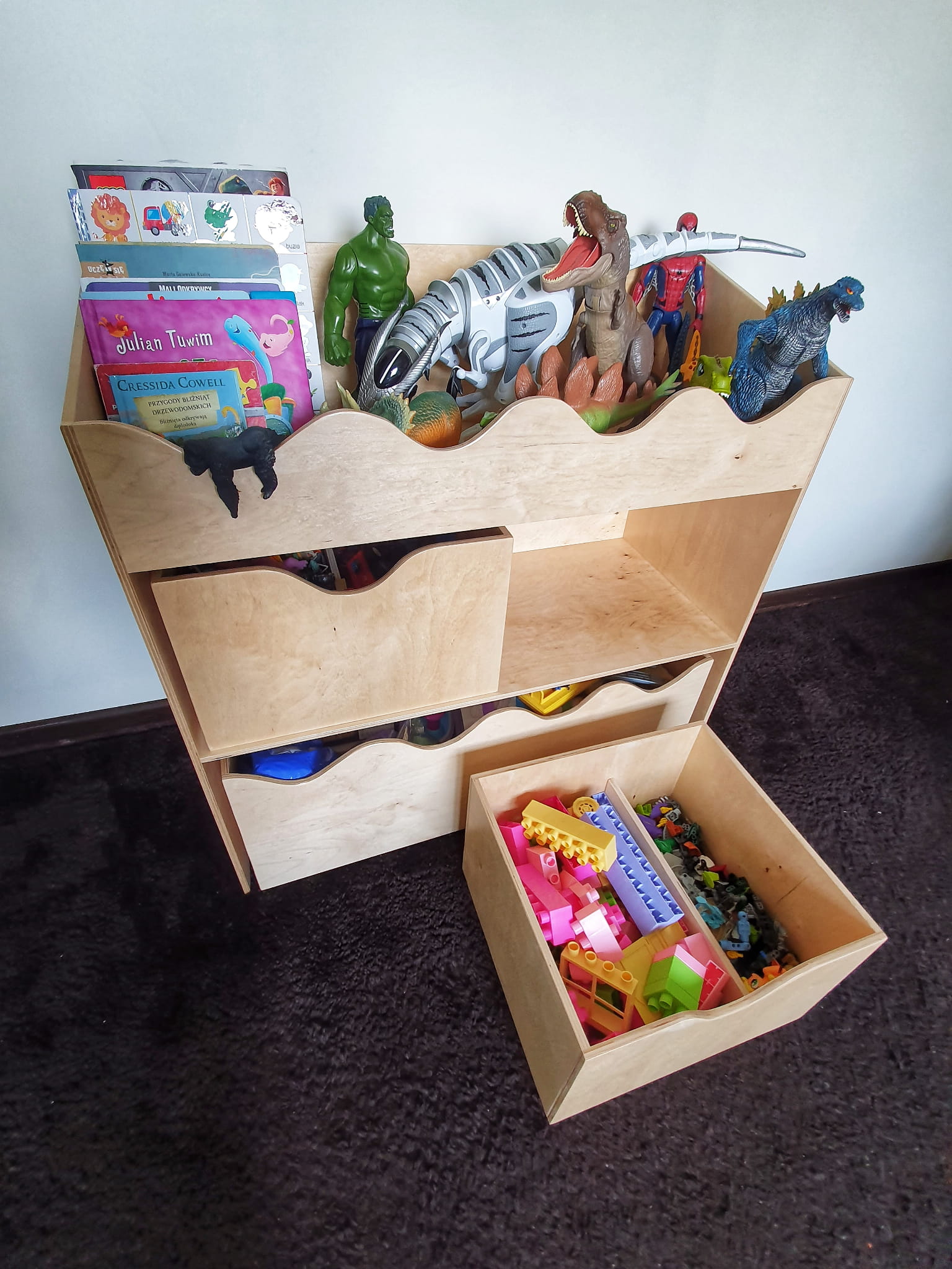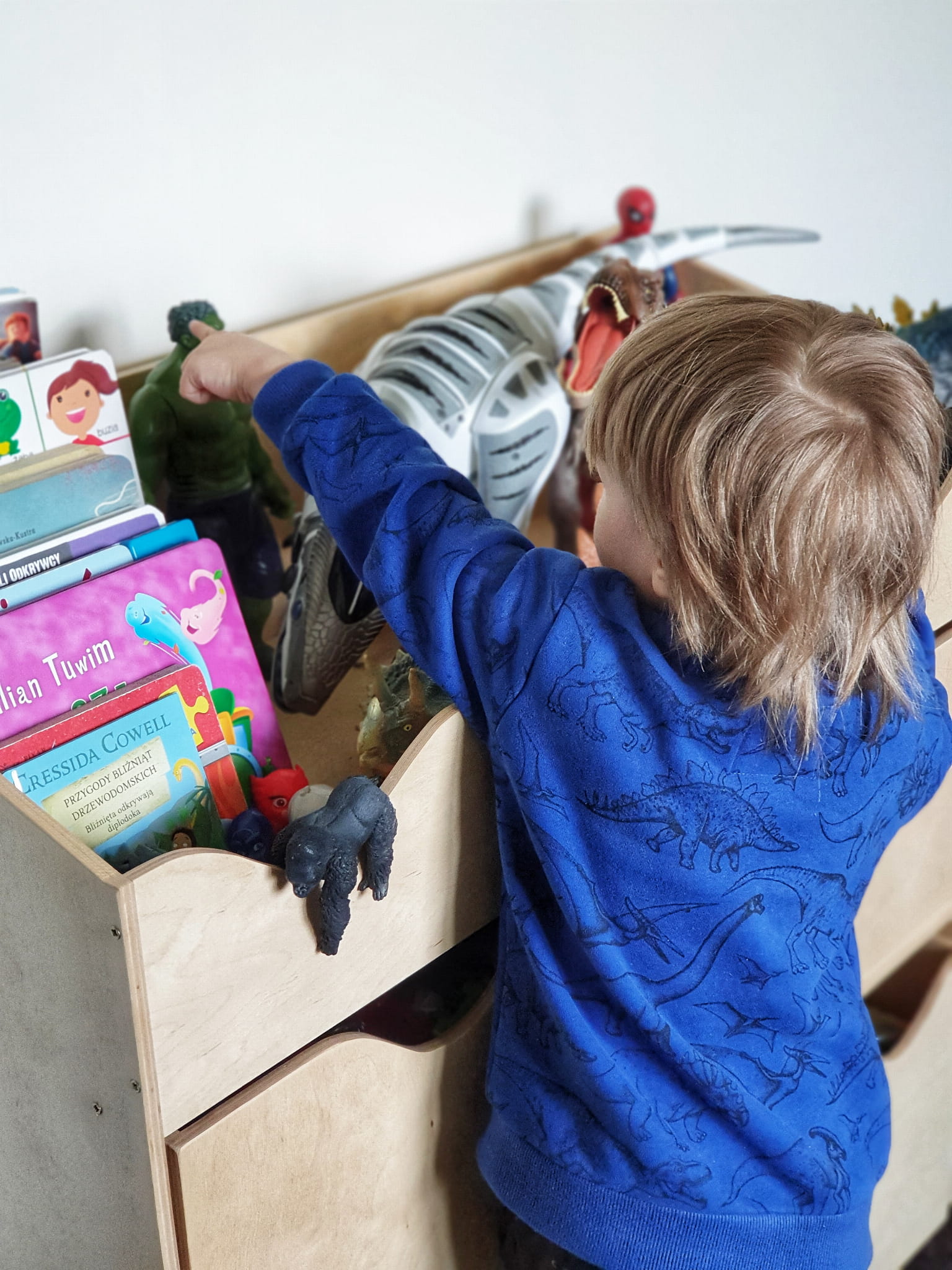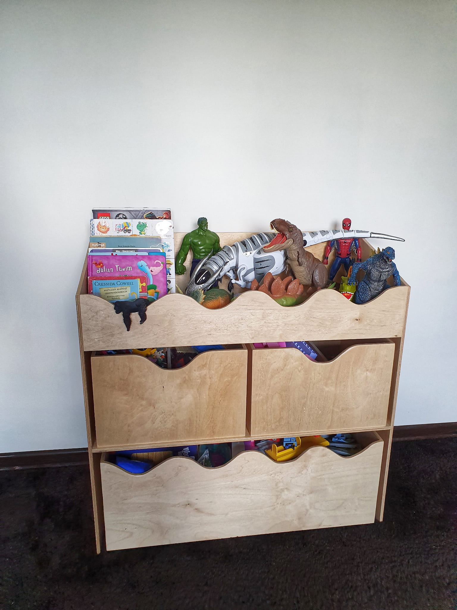 Drewniany stojący regał na zabawki dla dzieci