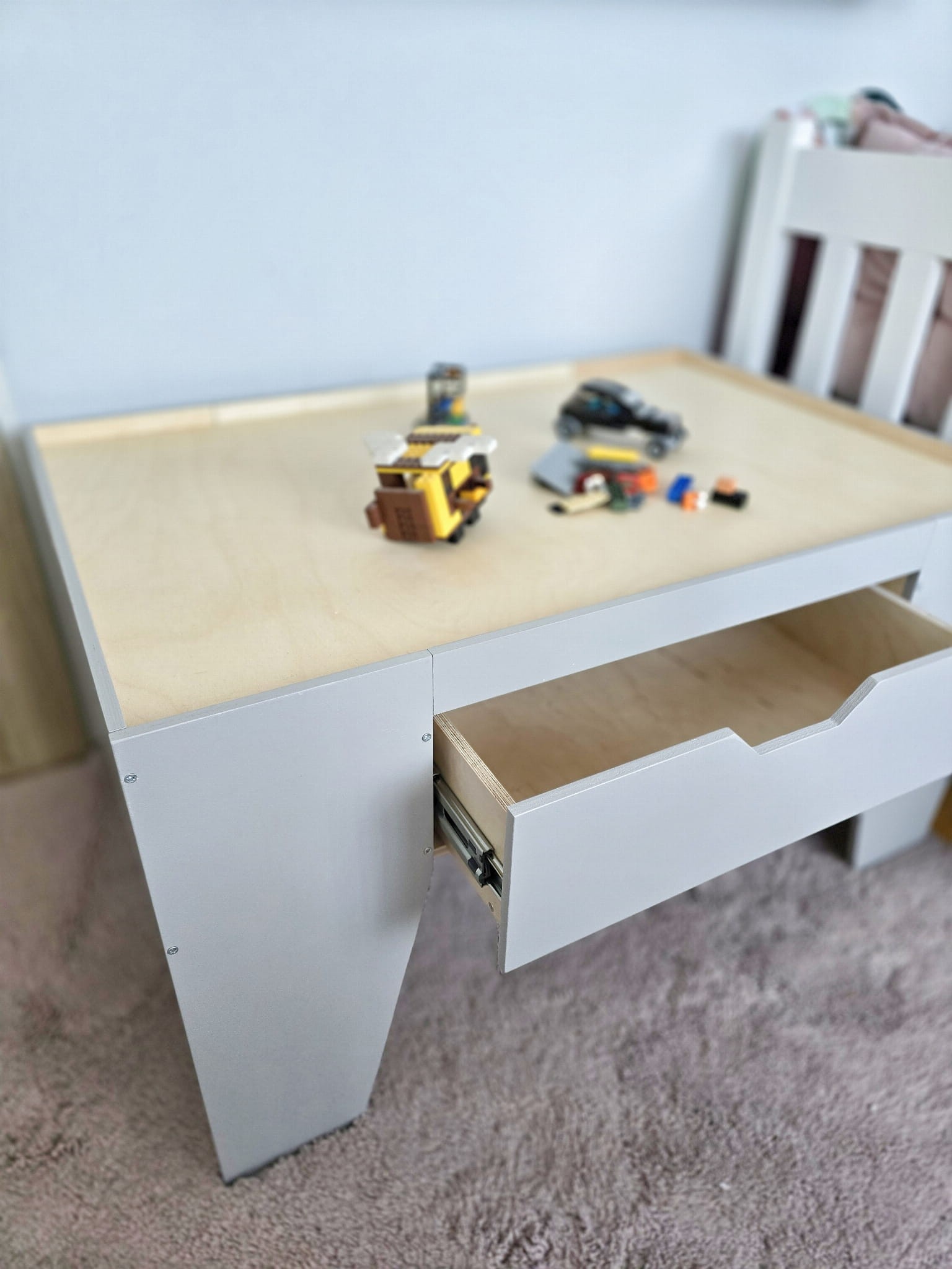Drewniany stolik dziecięcy z szufladą do układania klocków lego 90x60 szary