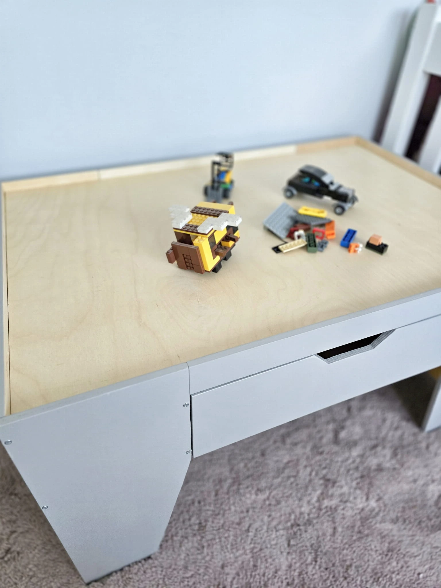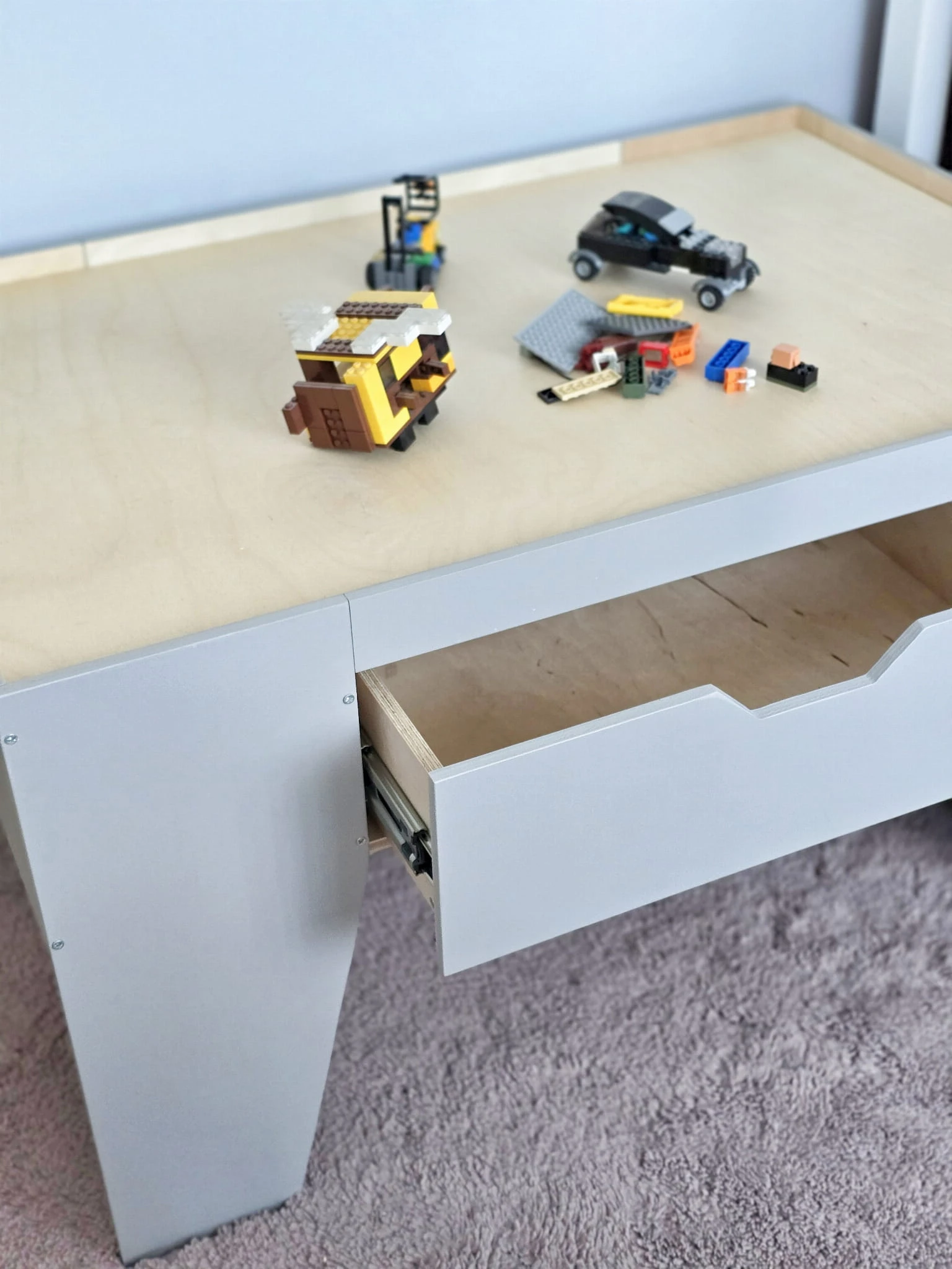 Stolik posiada burty, które chronią przed spadnięciem dzięki czemu świetnie układa się na nim klocki