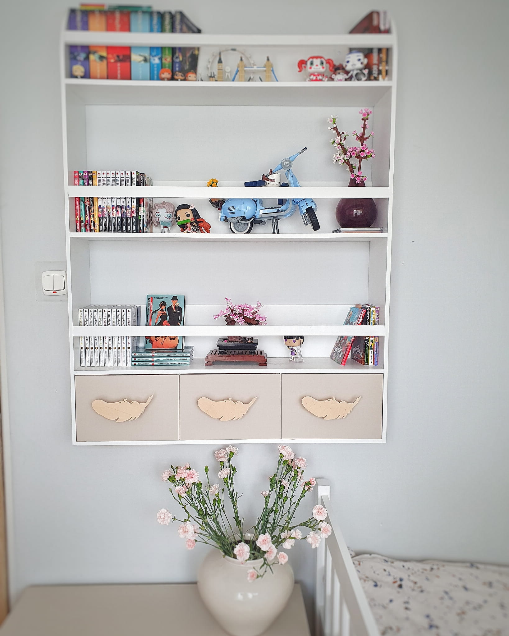 Półka regał wiszący na książki i zabawki w największym rozmiarze wykonany z drewnianej sklejki sosnowej. Regał pomalowany w kolorze białym wodorozcieńczalną emalią akrylową rekomendowaną przez Polskie Towarzystwo Alergologiczne bezpieczne i przeznaczone dla najmłodszych. Regał posiada 3 szufladki w kolorze beżowym z uchwytami w kształcie piórek w kolorze drewna.