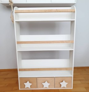 Półka regał wiszący na książki i zabawki w najmniejszym rozmiarze wykonany z drewnianej sklejki sosnowej. Regał pomalowany w kolorze białym wodorozcieńczalną emalią akrylową rekomendowaną przez Polskie Towarzystwo Alergologiczne bezpieczne i przeznaczone dla najmłodszych z elementami drewna pokrytymi ochronnym lakierem. Regał posiada 3 szufladki z uchwytami w kształcie gwiazdek w kolorze białym.