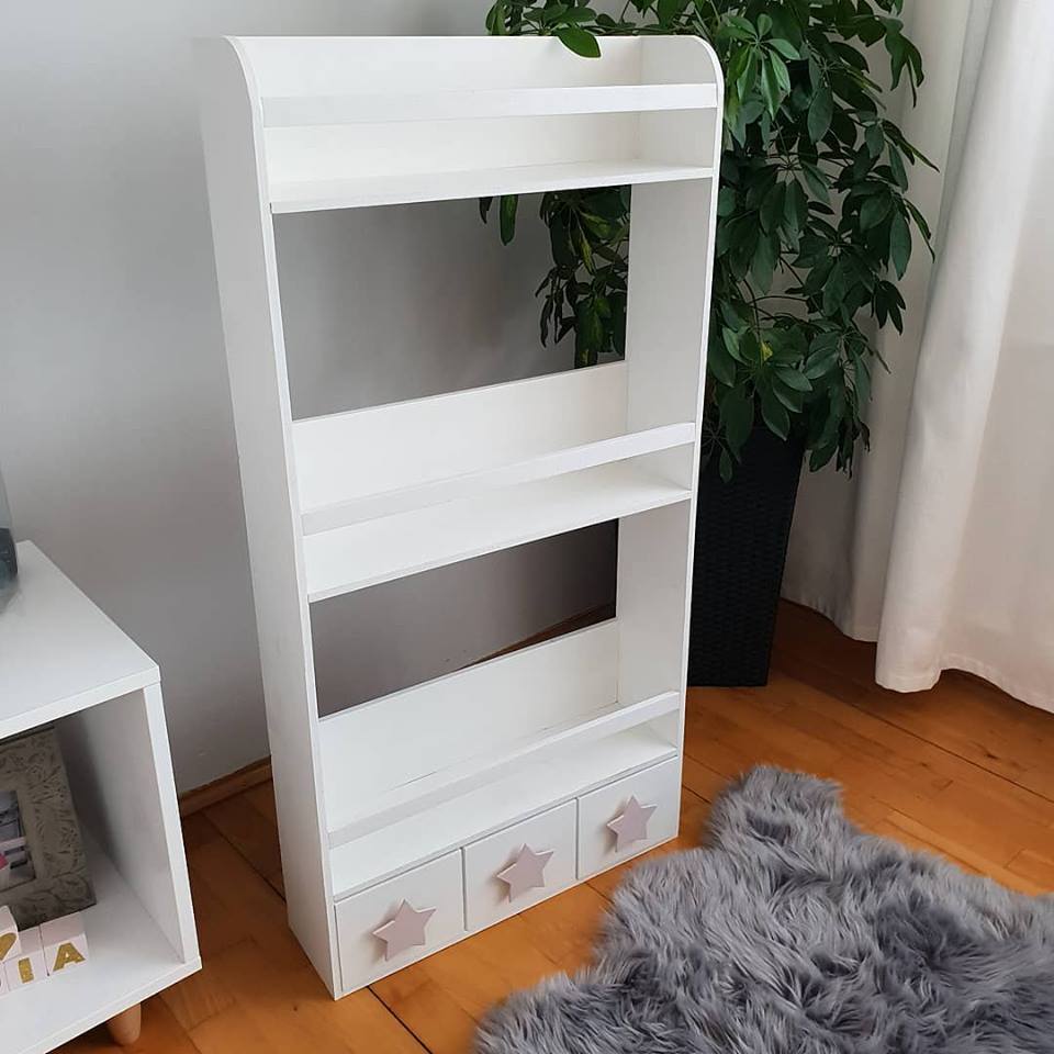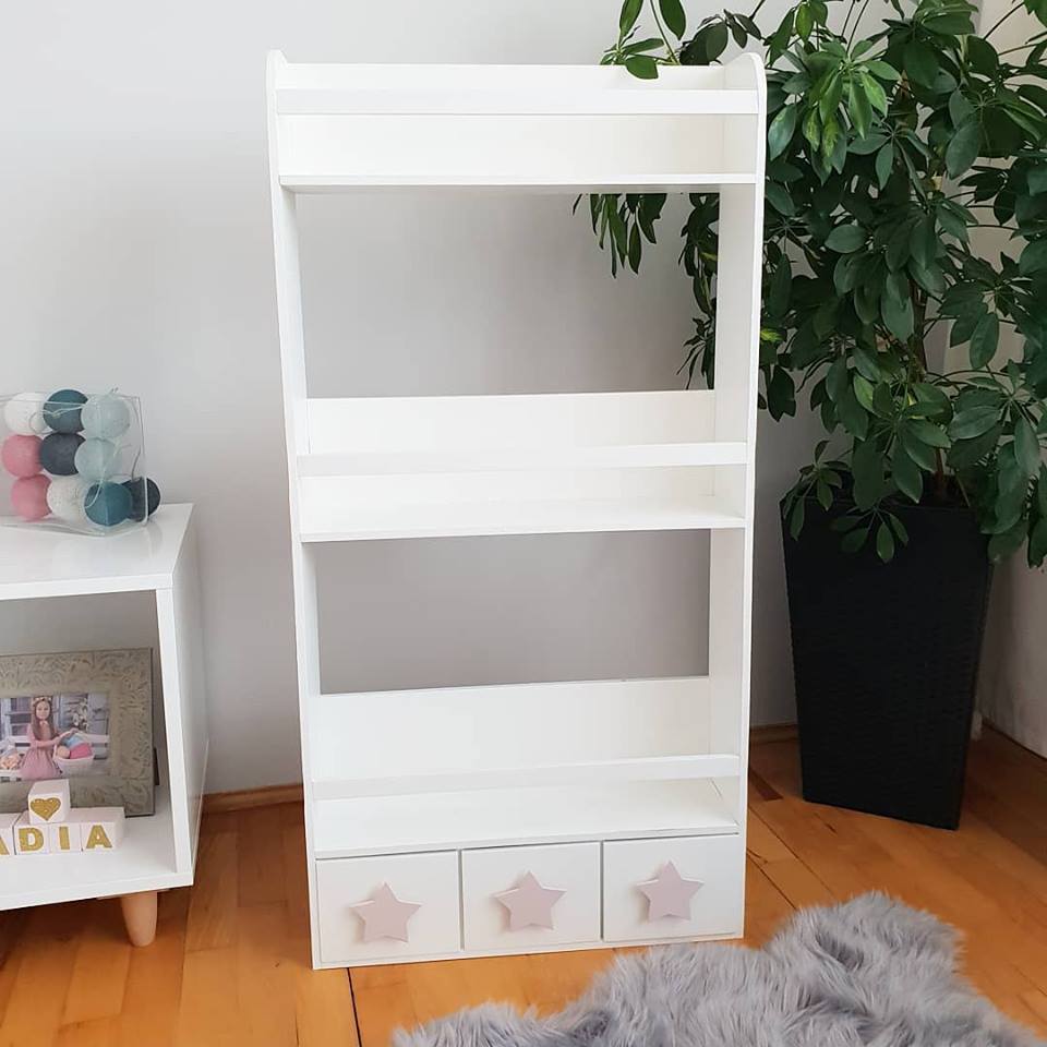 Półka regał wiszący na książki i zabawki w średnim rozmiarze wykonany z drewnianej sklejki sosnowej. Regał pomalowany w kolorze białym wodorozcieńczalną emalią akrylową rekomendowaną przez Polskie Towarzystwo Alergologiczne bezpieczne i przeznaczone dla najmłodszych. Regał posiada 3 szufladki z uchwytami w kształcie gwiazdek w kolorze pudrowego różu.