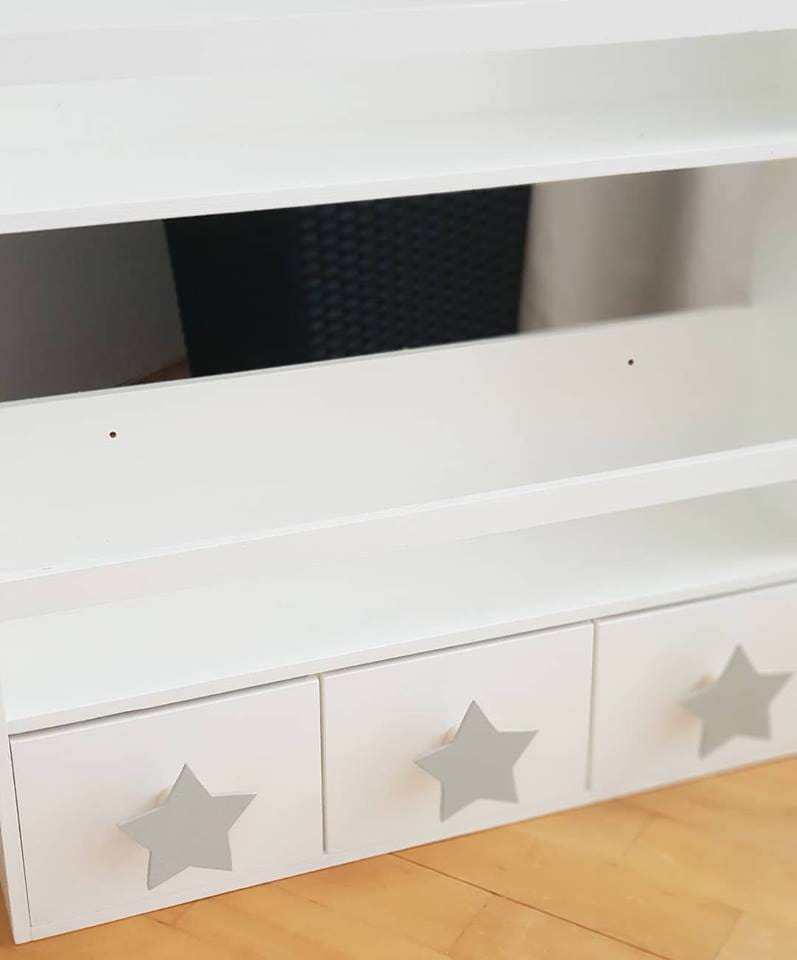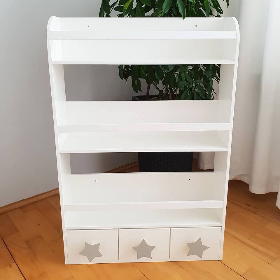 Półka regał wiszący na książki i zabawki w najmniejszym rozmiarze wykonany z drewnianej sklejki sosnowej. Regał pomalowany w kolorze białym wodorozcieńczalną emalią akrylową rekomendowaną przez Polskie Towarzystwo Alergologiczne bezpieczne i przeznaczone dla najmłodszych. Regał posiada 3 szufladki z uchwytami w kształcie gwiazdek w kolorze jasno szarym.