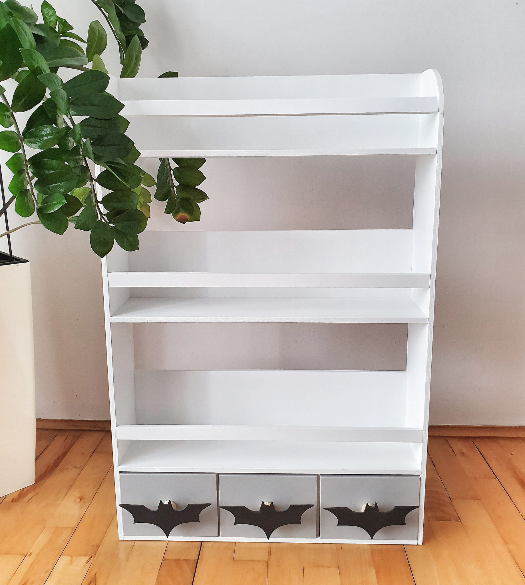 Półka regał wiszący na książki i zabawki w najmniejszym rozmiarze wykonany z drewnianej sklejki sosnowej. Regał pomalowany w kolorze białym wodorozcieńczalną emalią akrylową rekomendowaną przez Polskie Towarzystwo Alergologiczne bezpieczne i przeznaczone dla najmłodszych. Regał posiada 3 szare szufladki z uchwytami w kształcie Batmana w kolorze czarnym.