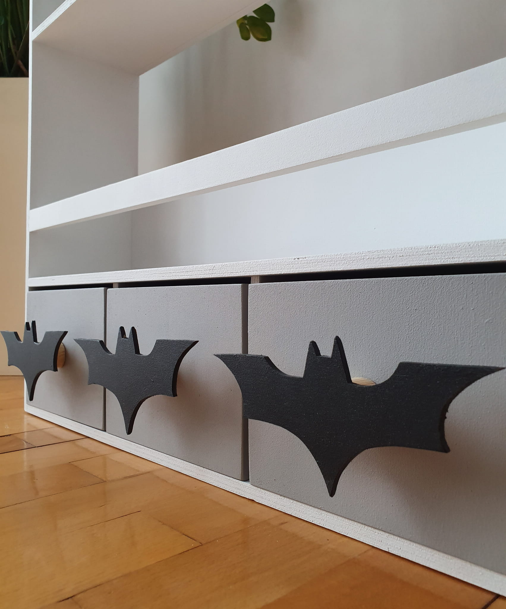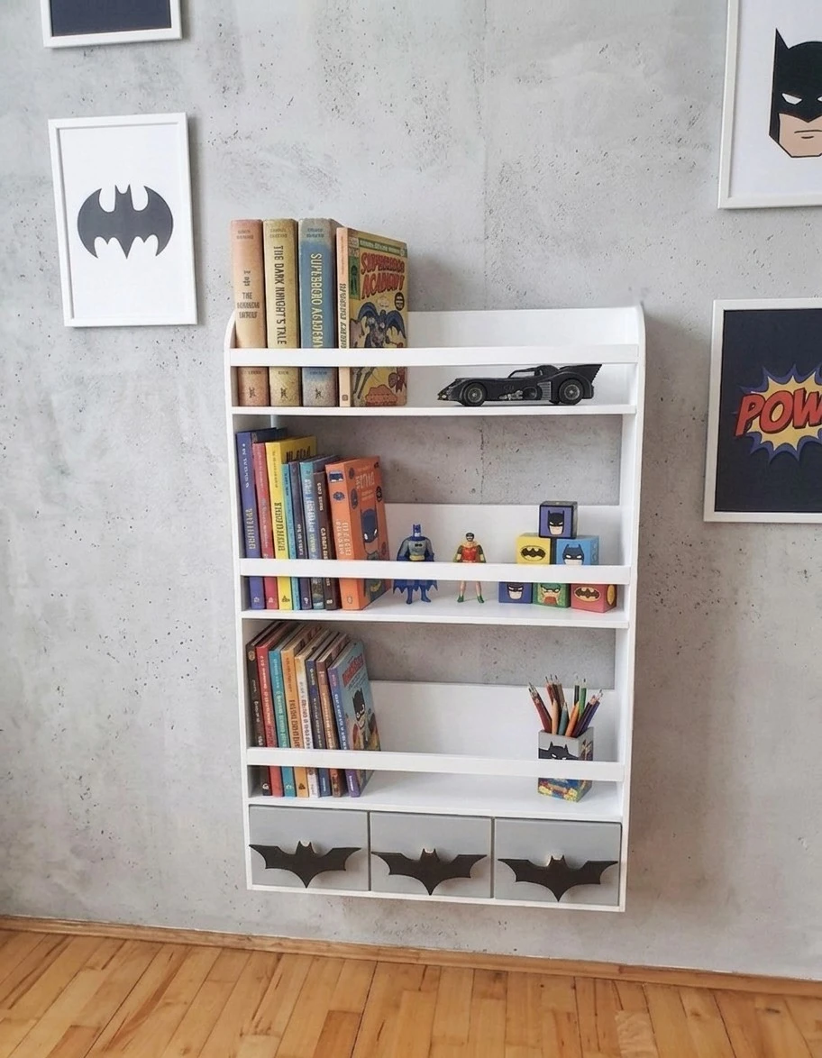 Drewniany wiszący regał biblioteczka dla dzieci biały z szarymi szufladkami i uchwytami Batman