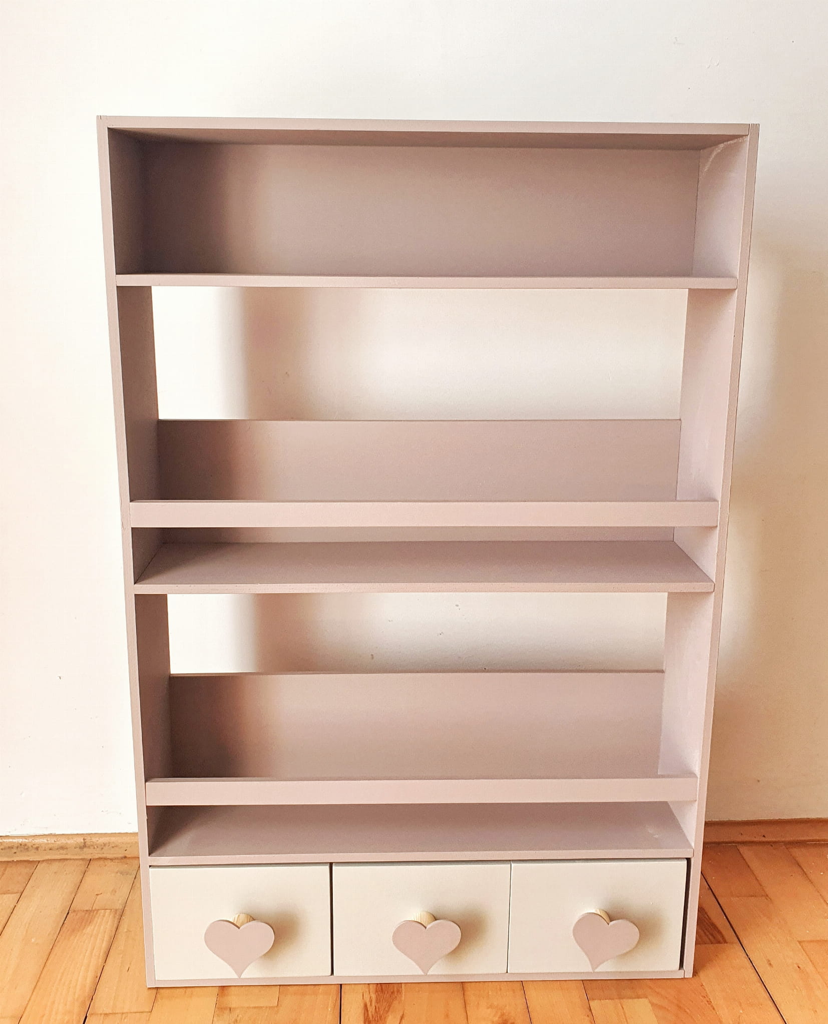 Półka regał wiszący na książki i zabawki w najmniejszym rozmiarze wykonany z drewnianej sklejki sosnowej. Regał pomalowany w kolorze brudny róż wodorozcieńczalną emalią akrylową rekomendowaną przez Polskie Towarzystwo Alergologiczne bezpieczne i przeznaczone dla najmłodszych. Regał posiada 3 szufladki w kolorze kaszmirowym z uchwytami w kształcie serduszek w kolorze brudnego różu .