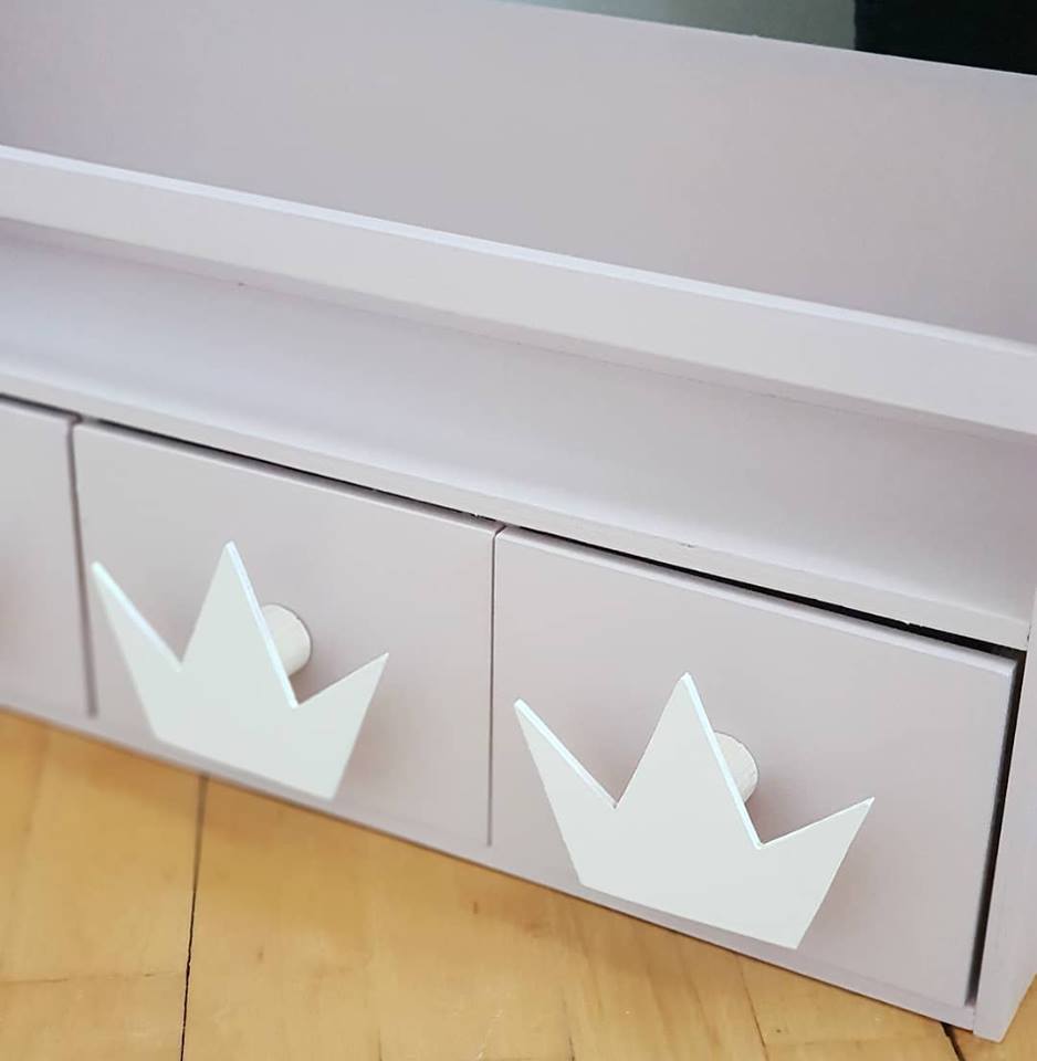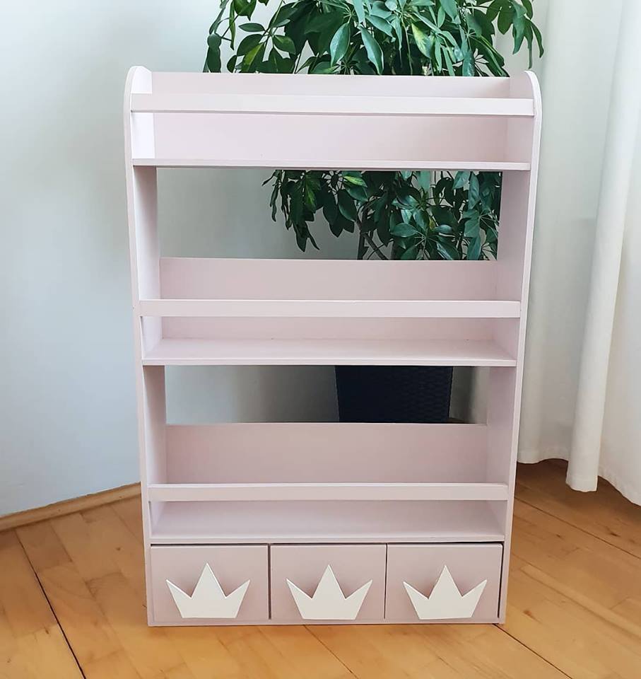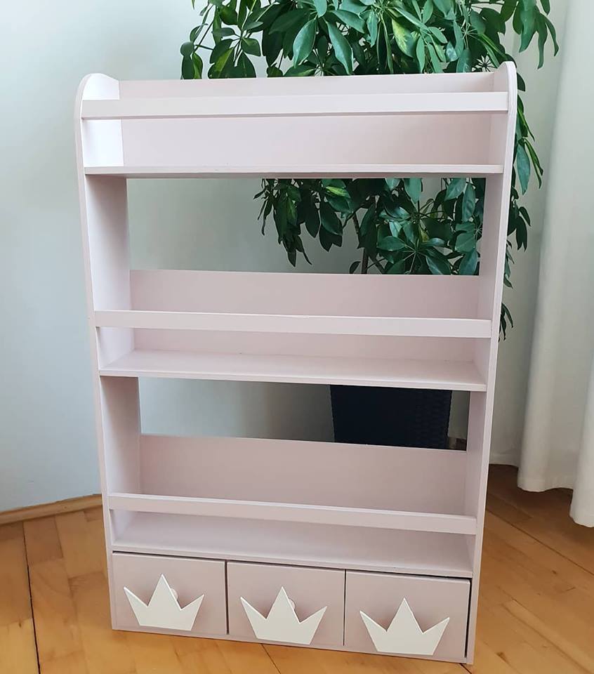 Półka regał wiszący na książki i zabawki w najmniejszym rozmiarze wykonany z drewnianej sklejki sosnowej. Regał pomalowany w kolorze pudrowy róż wodorozcieńczalną emalią akrylową rekomendowaną przez Polskie Towarzystwo Alergologiczne bezpieczne i przeznaczone dla najmłodszych. Regał posiada 3 szufladki z uchwytami w kształcie korony w kolorze białym .